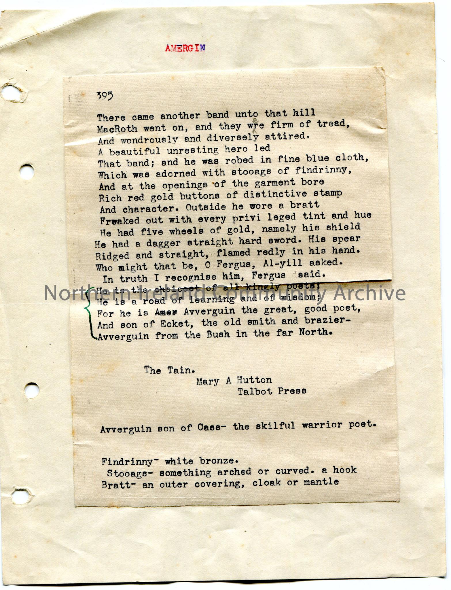 Typed page stuck to larger page. Title "Amergin". Typed poem or words to song re Avverguin son of Cass. Taken from book 'The Tain' by Mary A Hutton, Talbot Press. Meaning of words in poem/song noted at bottom of page.