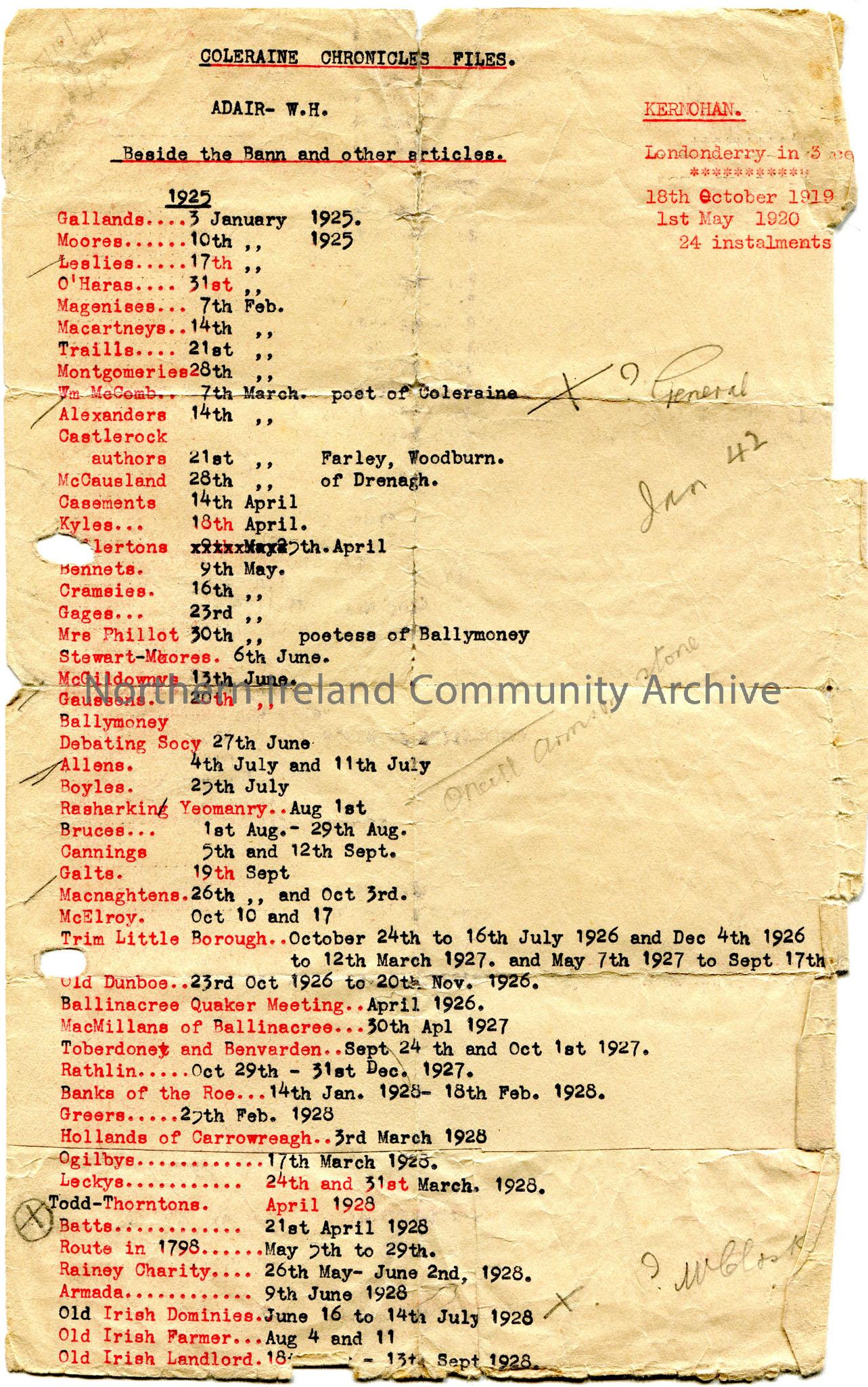Typed page titled, “Coleraine Chronicles Files. Adair- W.H. Beside the Bann and other articles”. Majority of list are family names and place names. Da…