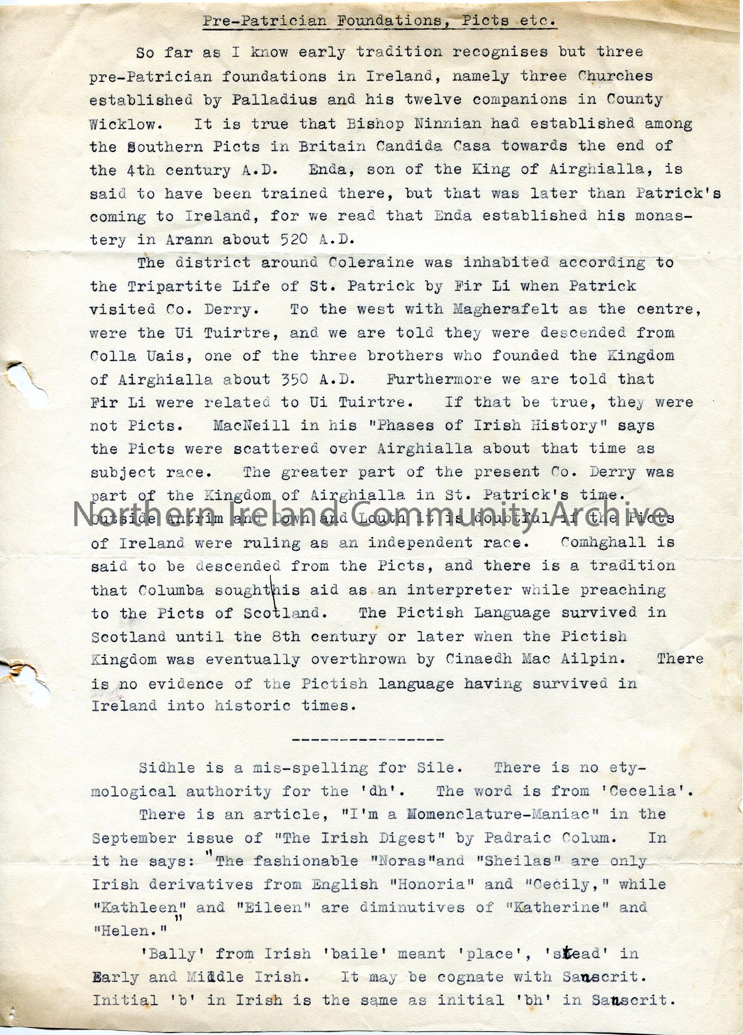 Typed page under heading ‘Pre-patrician Foundations, Picts etc’, mentioning Coleraine