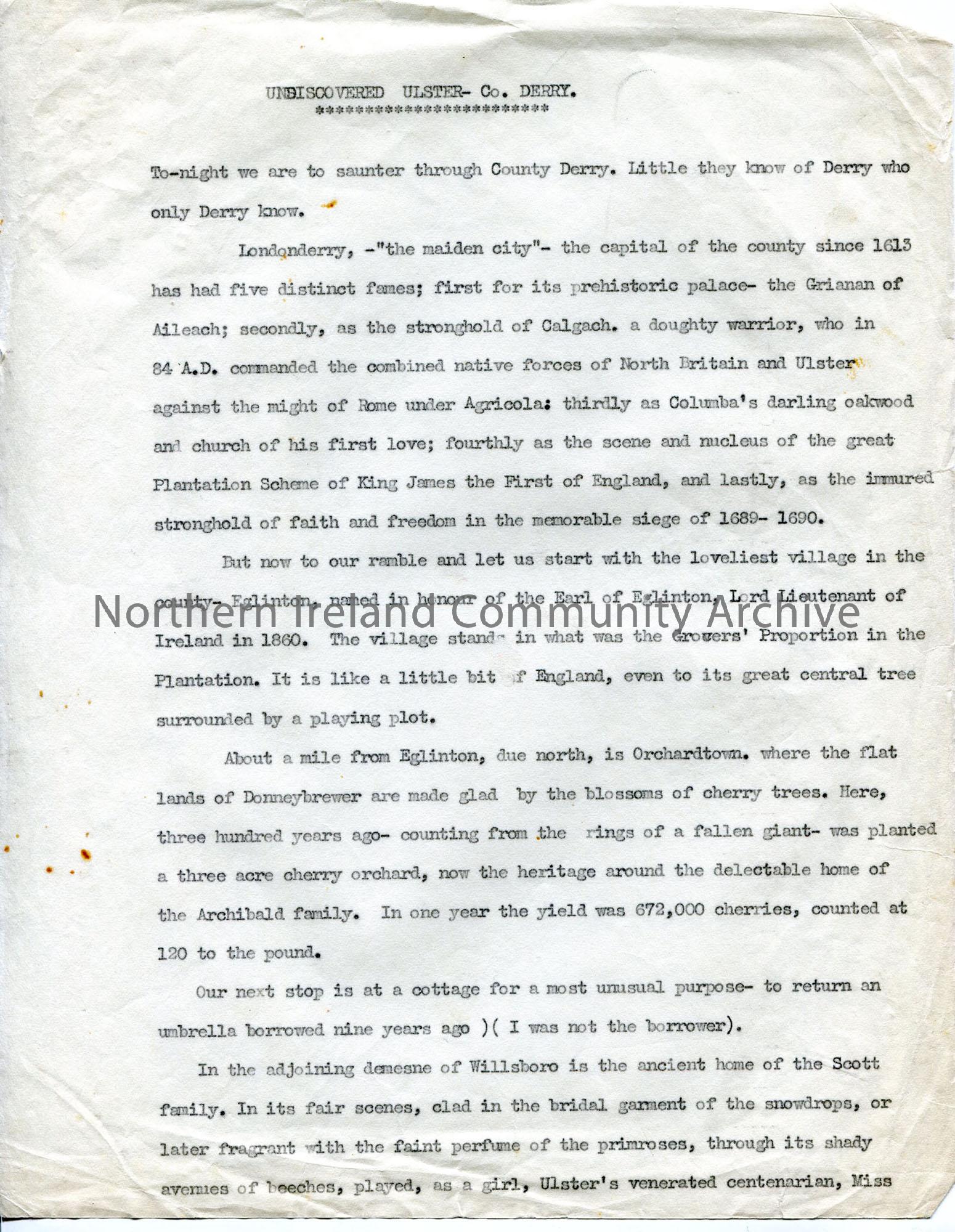 Typed page under heading ‘Undiscovered Ulster – Co Derry’ – first page of script – remainder not present.
