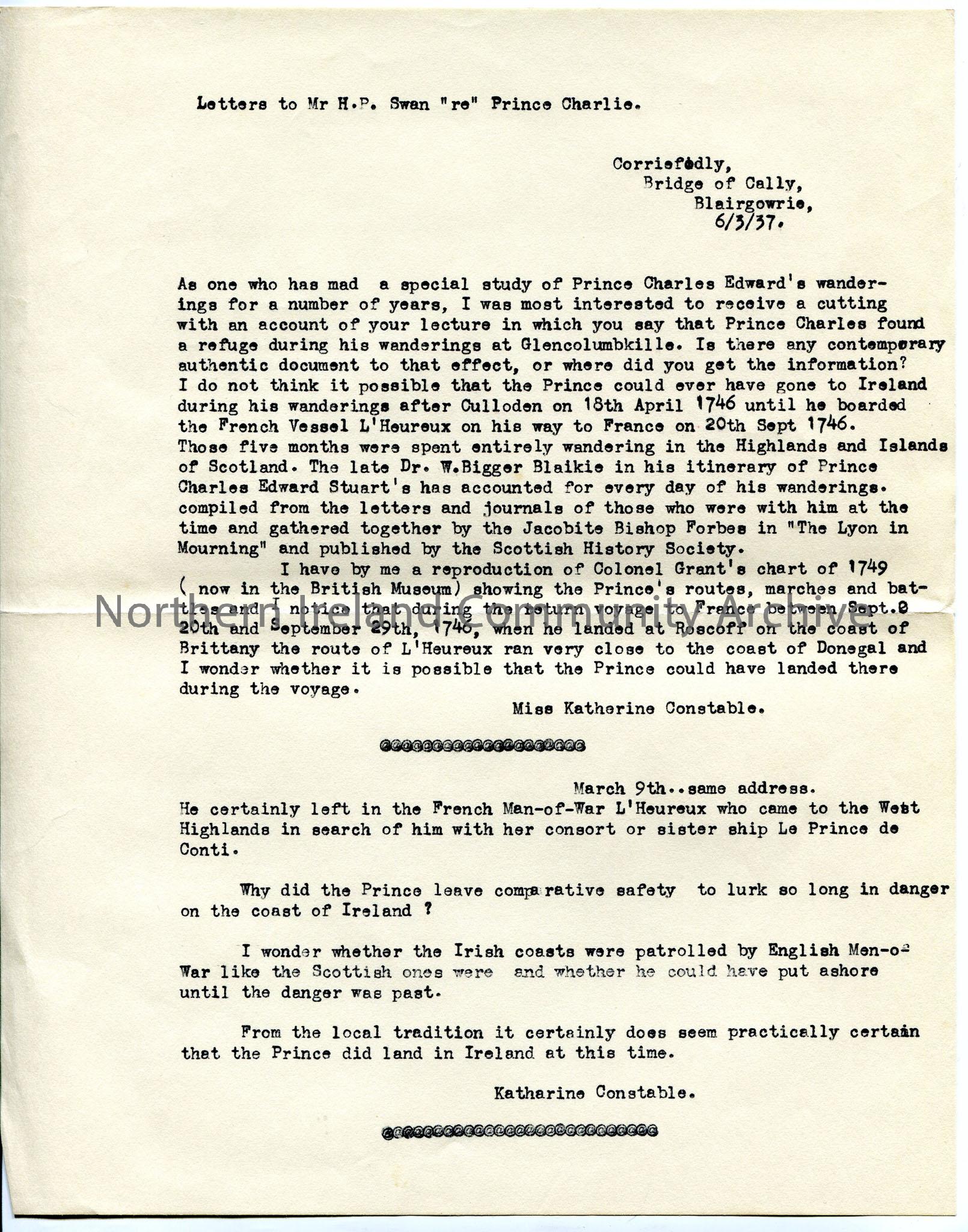 Typed page with extracts from 2 letters challenging story of Prince Charlie's stay in Donegal - wanderings in Scotland from aftermath of Culloden until picked up by Heureux/Le Prince de Conty are well documented so when would he have stayed in Ireland, though local tradition makes it 'practically' certain that he did