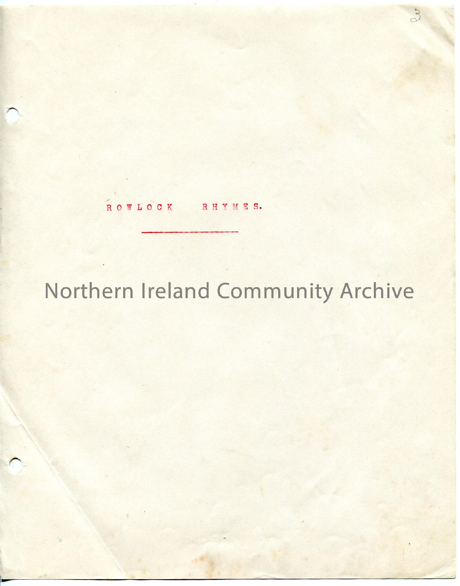 Typed page with Title of book alone. Page from loose manuscript of Rowlock Rhymes and Songs of Exile- a book of verse edited by Sam Henry. The author, Robert McMullan from Portballintrae, had the pen name 'North Antrim' and was "imbued with the Celtic spirit" and interested in the fishermen of the north coast of Antrim