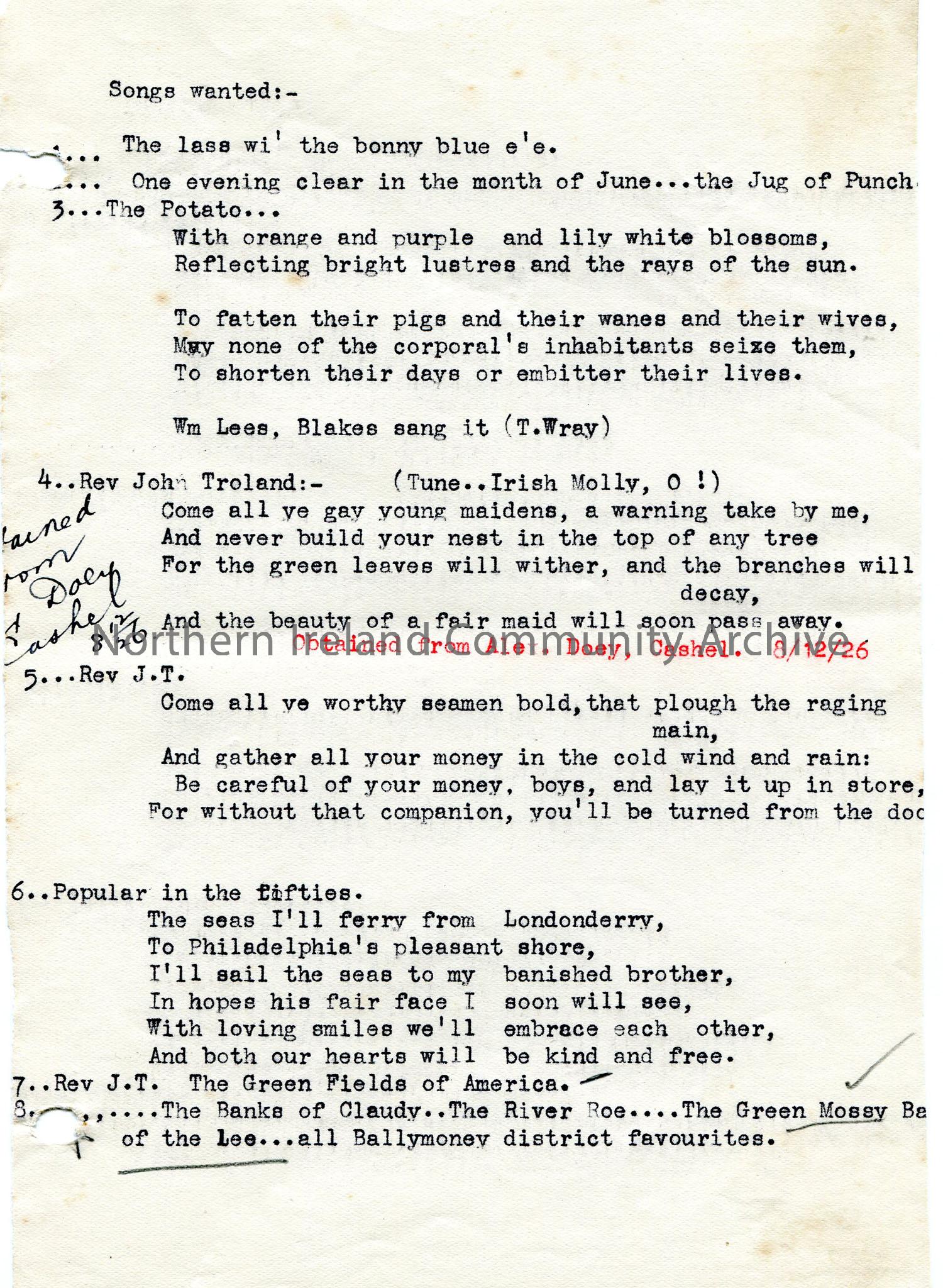 Typed pages with ‘Songs Wanted’ – several names entered and ‘obtained’ in red, with name of donor.