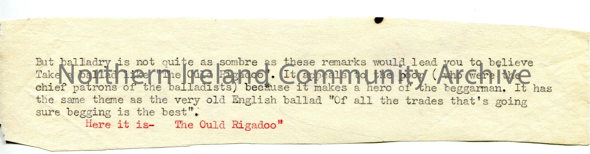 Typed paragraph – beggarman ballad – ? part of whole script on ballads.