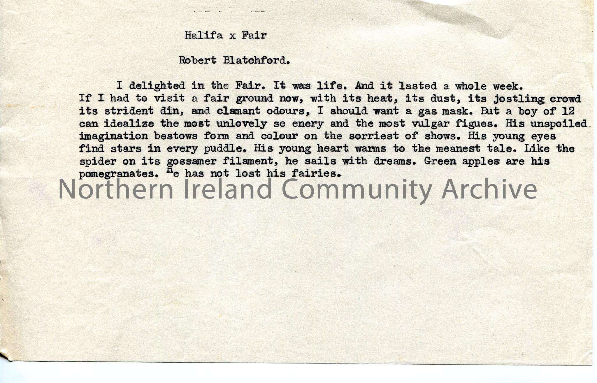 Typed paragraph headed ‘Halifax Fair’ – reminiscing on visit to fair as 12 year old