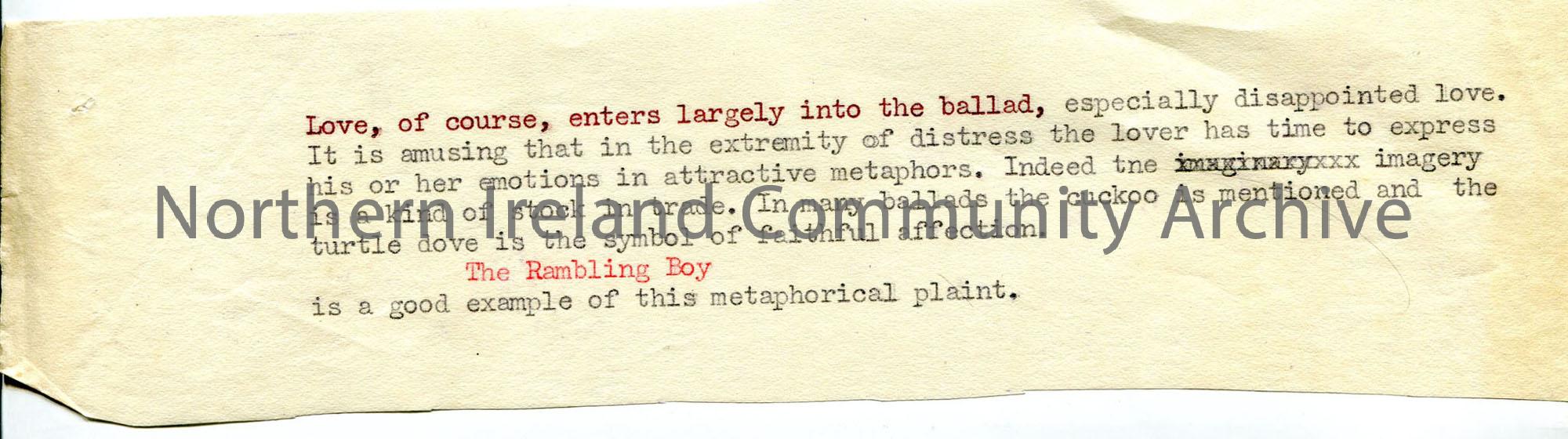 Typed paragraph – love ballads – ? part of whole script on ballads.