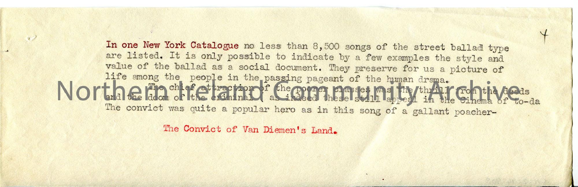 Typed paragraph re New York street ballad - ? part of whole script on ballads. Number '4' handwritten top right