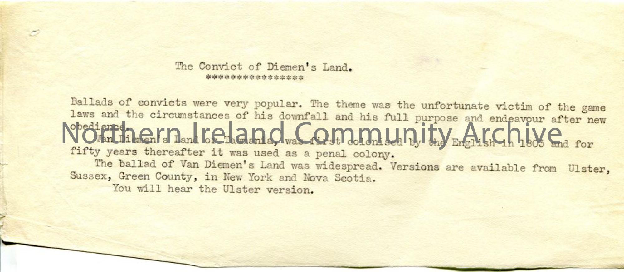 Typed paragraph under heading 'The Convict of Van Dieman's Land' - a convict ballad - about various versions of it - ? part of whole script on ballads.