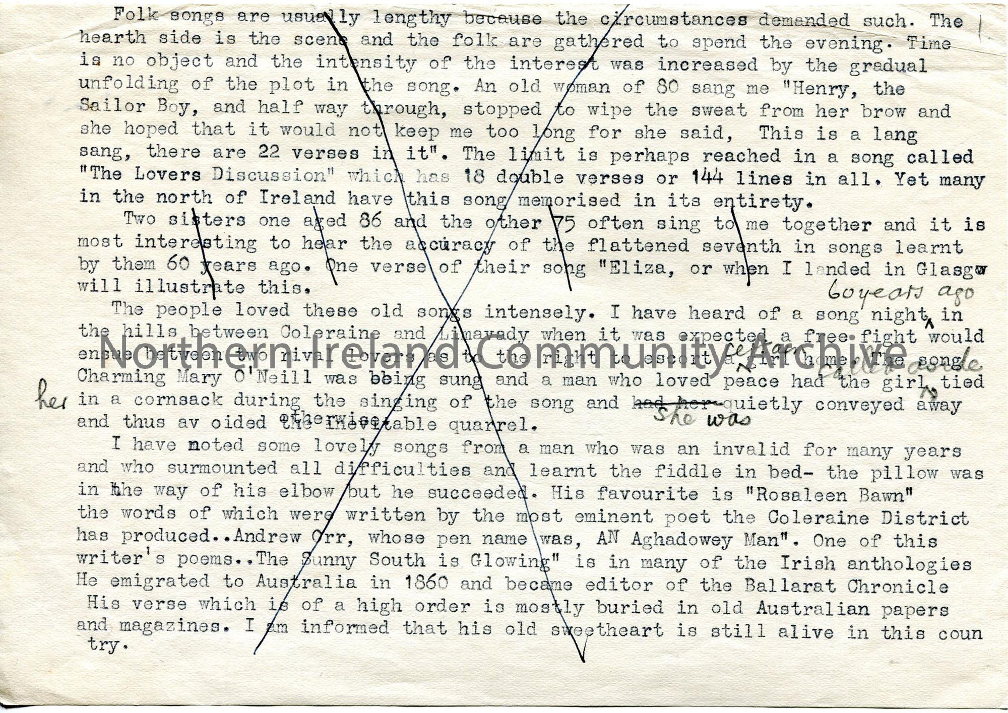 Typed paragraphs relating to folk songs – appears to be part of script with fireside setting, with 2 elderly sisters singing. Tells of other settings …