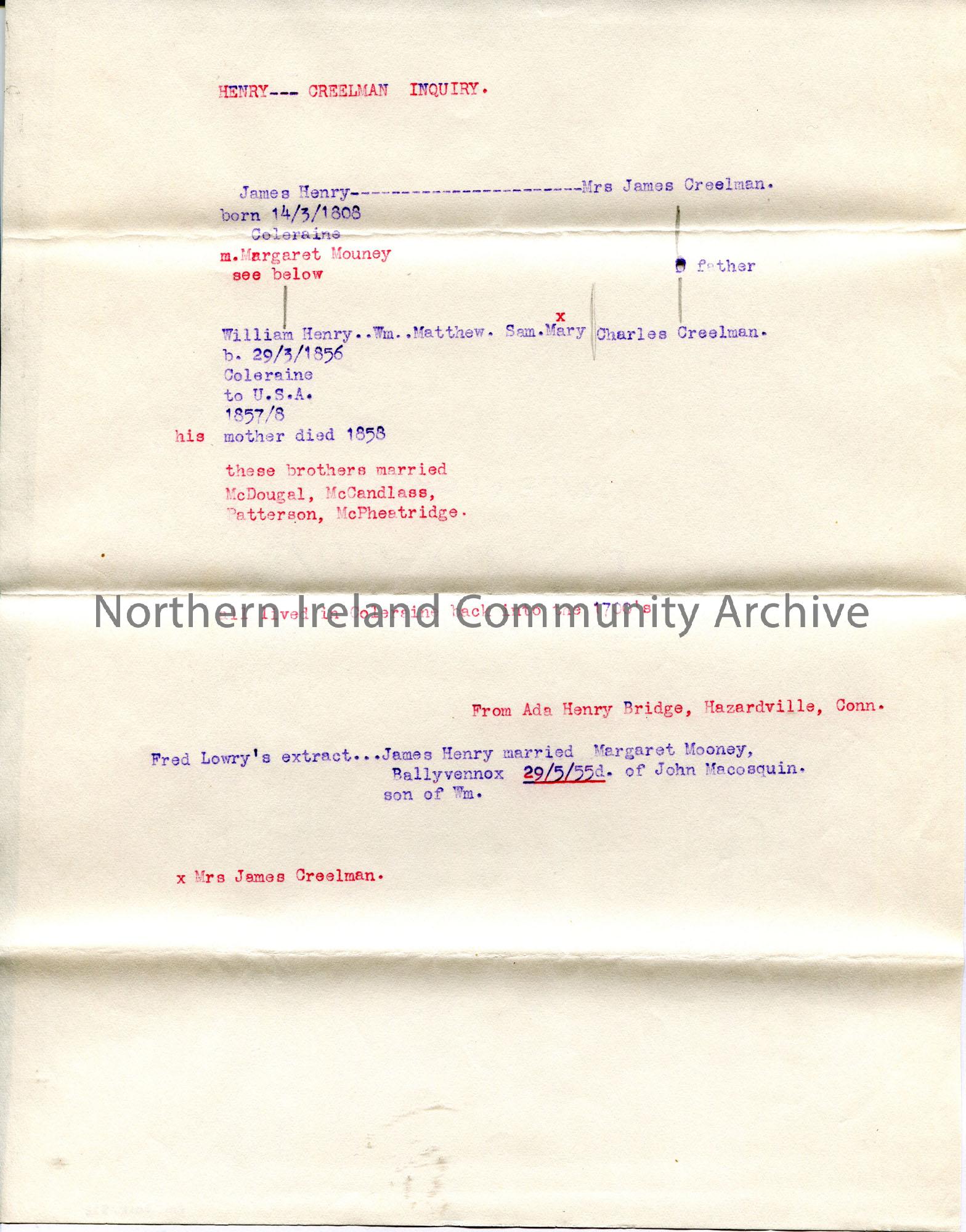 Typed part of family tree for surname Henry of Coleraine. Headed ‘Henry — Creelman Inquiry’. Refers to names James Henry b.1808 and William Henry b….
