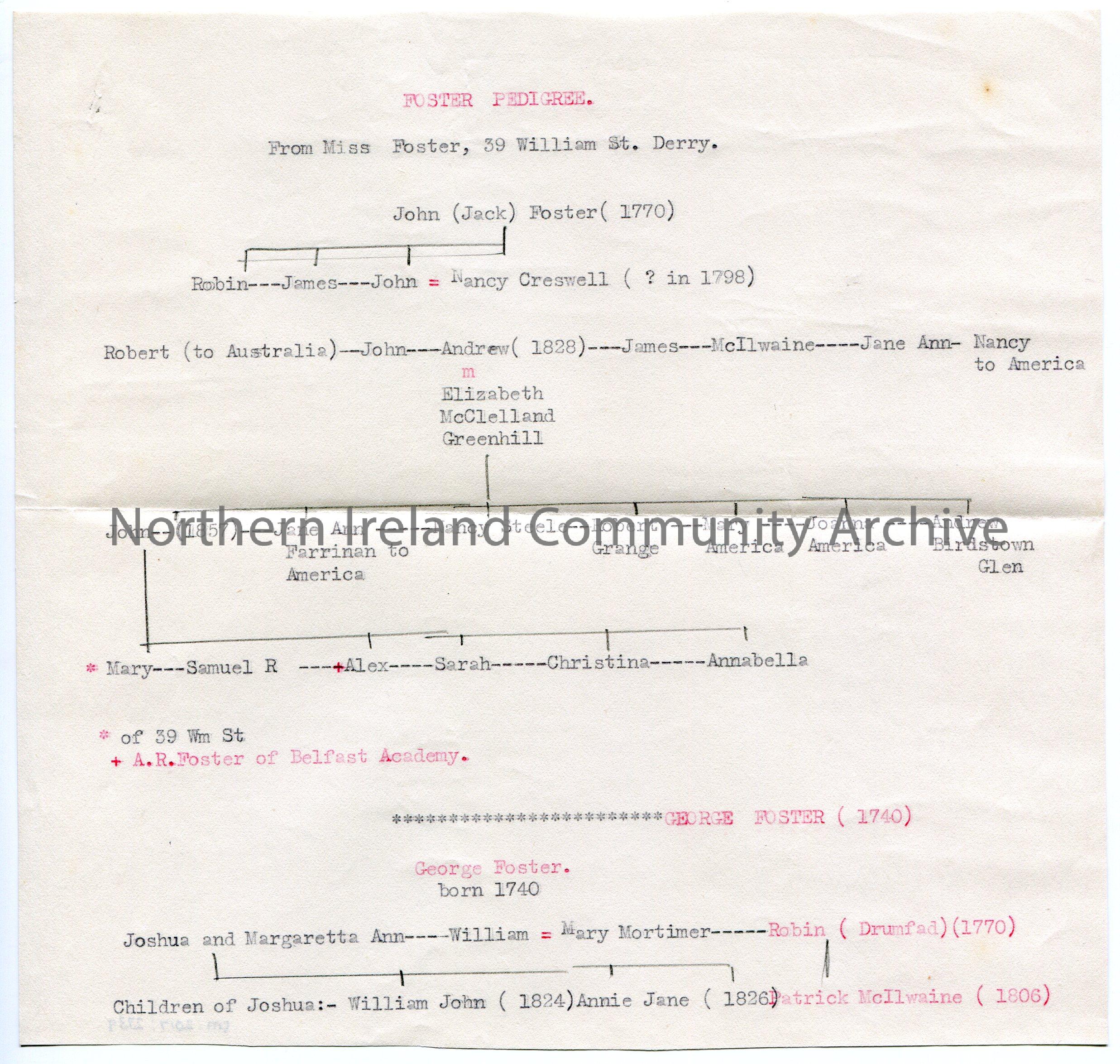 Typed pedigree of Foster family. From Miss Foster, 39 William Street, Derry. Begins with John (Jack) Foster, b. 1770.