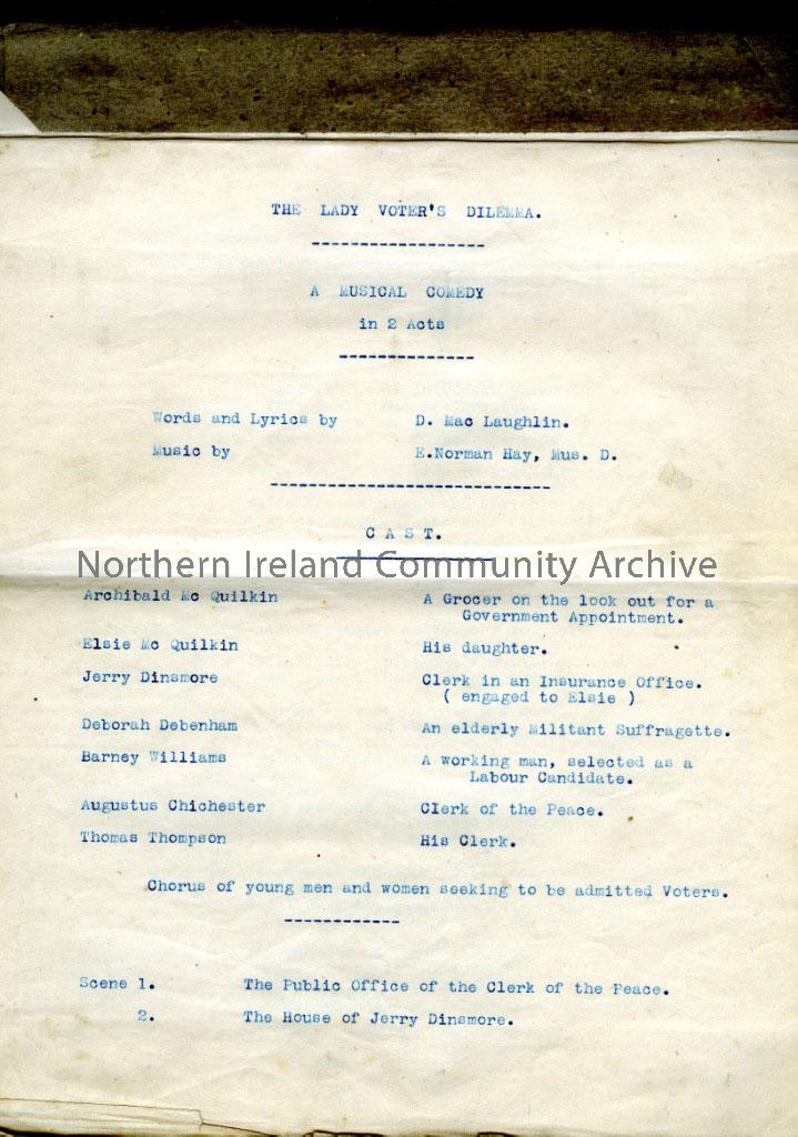 Typed play script titled 'Musical Comedy in 2 acts - 'The Lady Voter's Dilemma', words and lyrics by D.MacLaughlin, Music by E Norman Hay, Mus.D'. Prompt copy. First produced in Coleraine Town Hall 18th, 19th and 20th of December 1918. With reviews from the Coleraine Chronicle and the Belfast Evening Telegraph attached at the back.