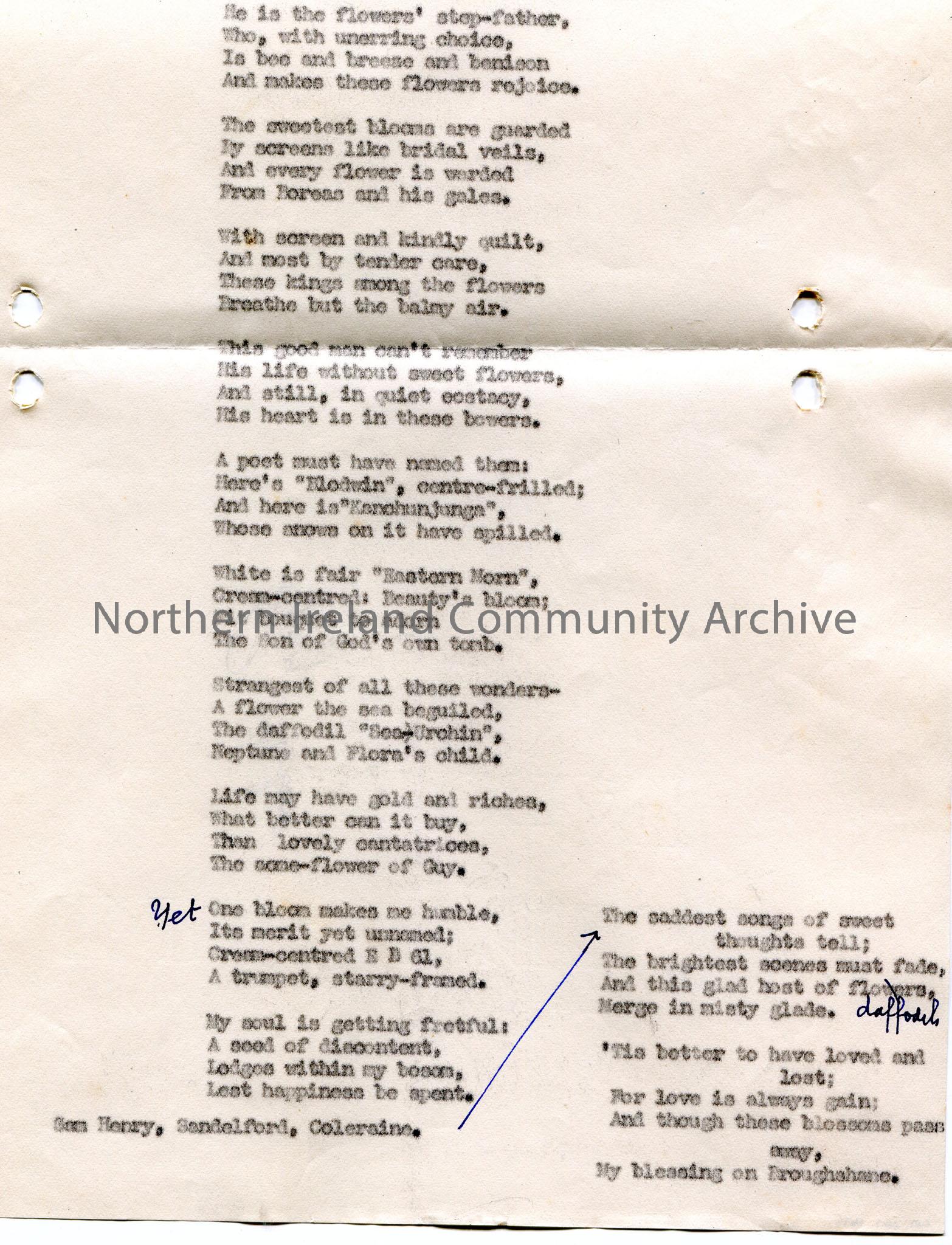 Typed poem, 15 verses, by Sam Henry, Sandelford, Coleraine. A Tribute to the Triumph of the Gardener's Art. Composed among the flowers at Knowehead, Broughshane on 18th April, 1939. Annotated version. Mentions Broughshane and Guy Wilson.