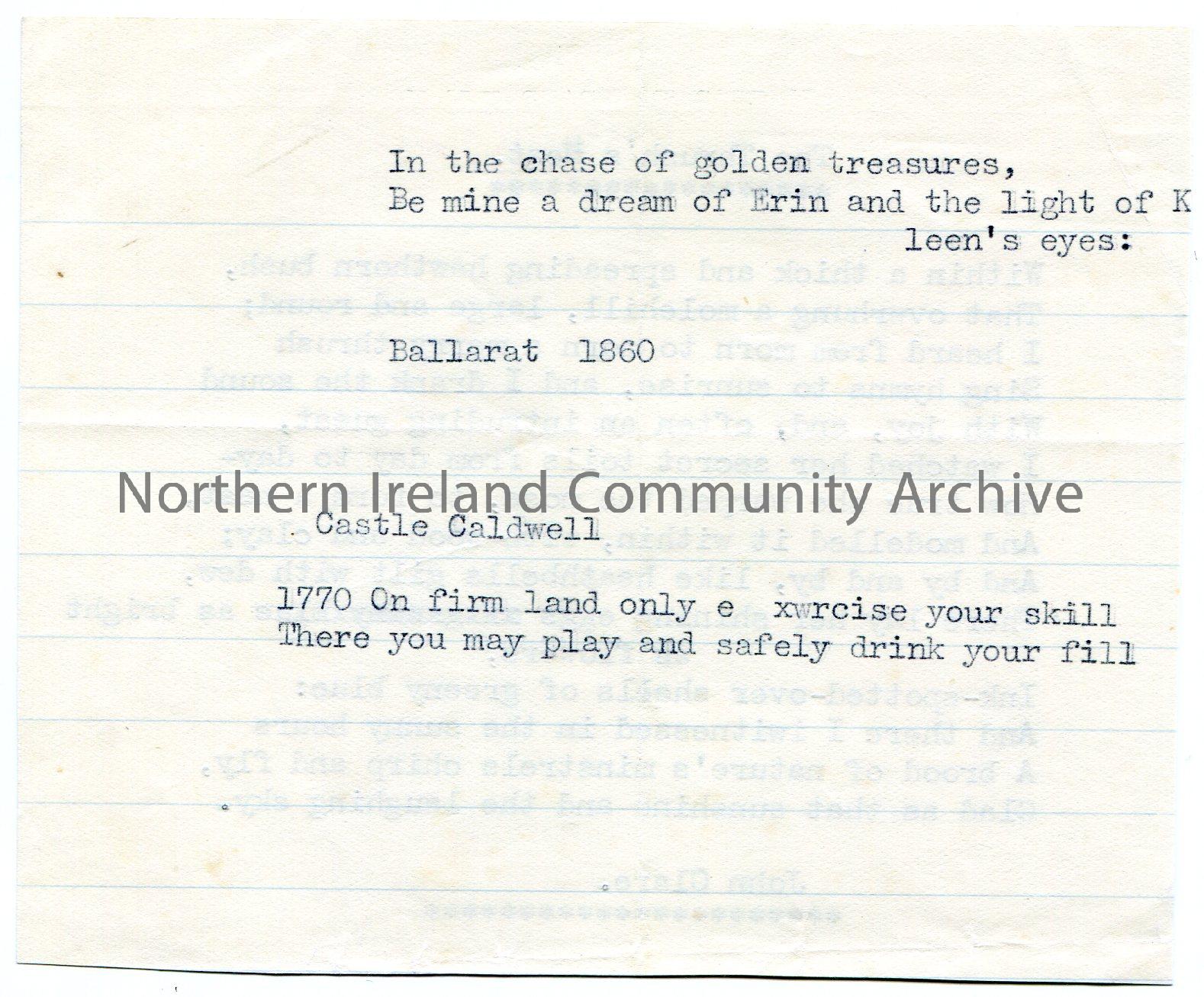 Typed poem by John Clare titled, 'The Thrush's Nest'. Brief note re Castle Caldwell on other side of page.