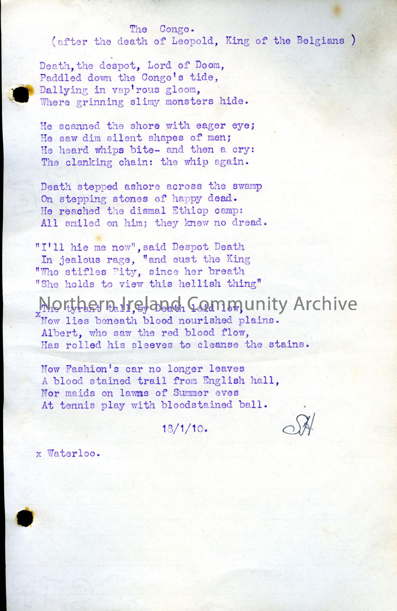 Typed poem by Sam Henry titled ‘The Congo. (after the death of Leopold, King of the Belgians)’. Dated 18/1/10 and signed S.H.