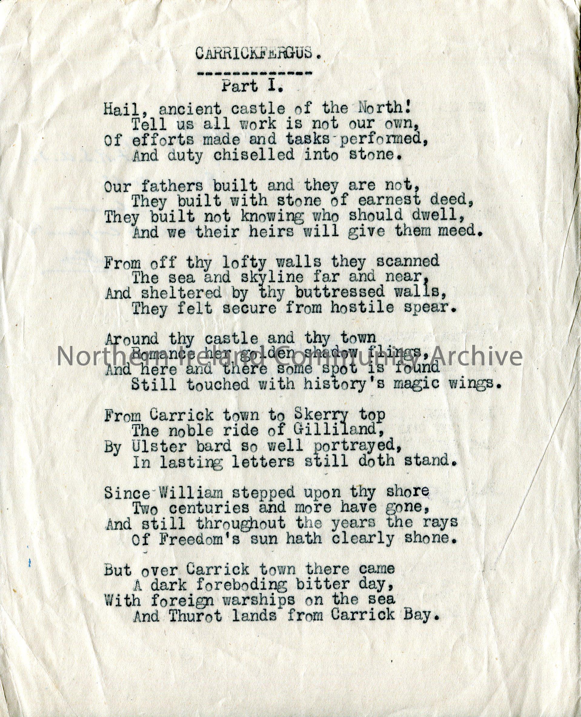 Typed poem (folded page) titled, 'Carrickfergus' by David Gordon Montgomery, Lisrodden, Portglenone, 10th June, 1942. Re the history of the town and its castle. Provides notes on copyright. Handwritten note on front cover 'To Samuel Henry, Esq., F.R.S.A.I, Sandelford, Coleraine. With the author's compliments. ...'.
