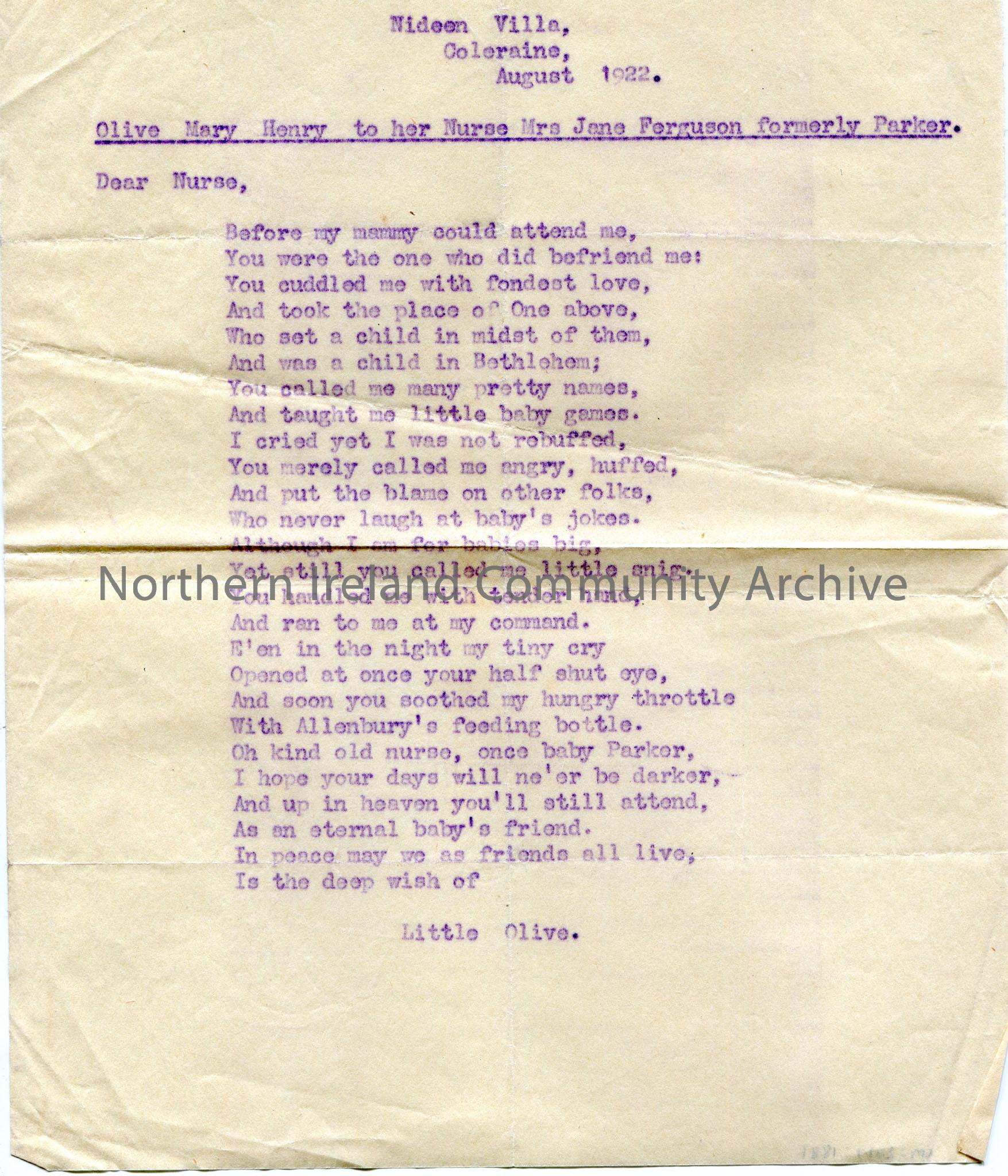 Typed poem - Olive Mary Henry to her Nurse, Mrs Jane Ferguson, formerly Parker. Re how she attended to Olive when she was a baby. Address of Nideen Villa, Coleraine and dated August, 1922 at top of page.