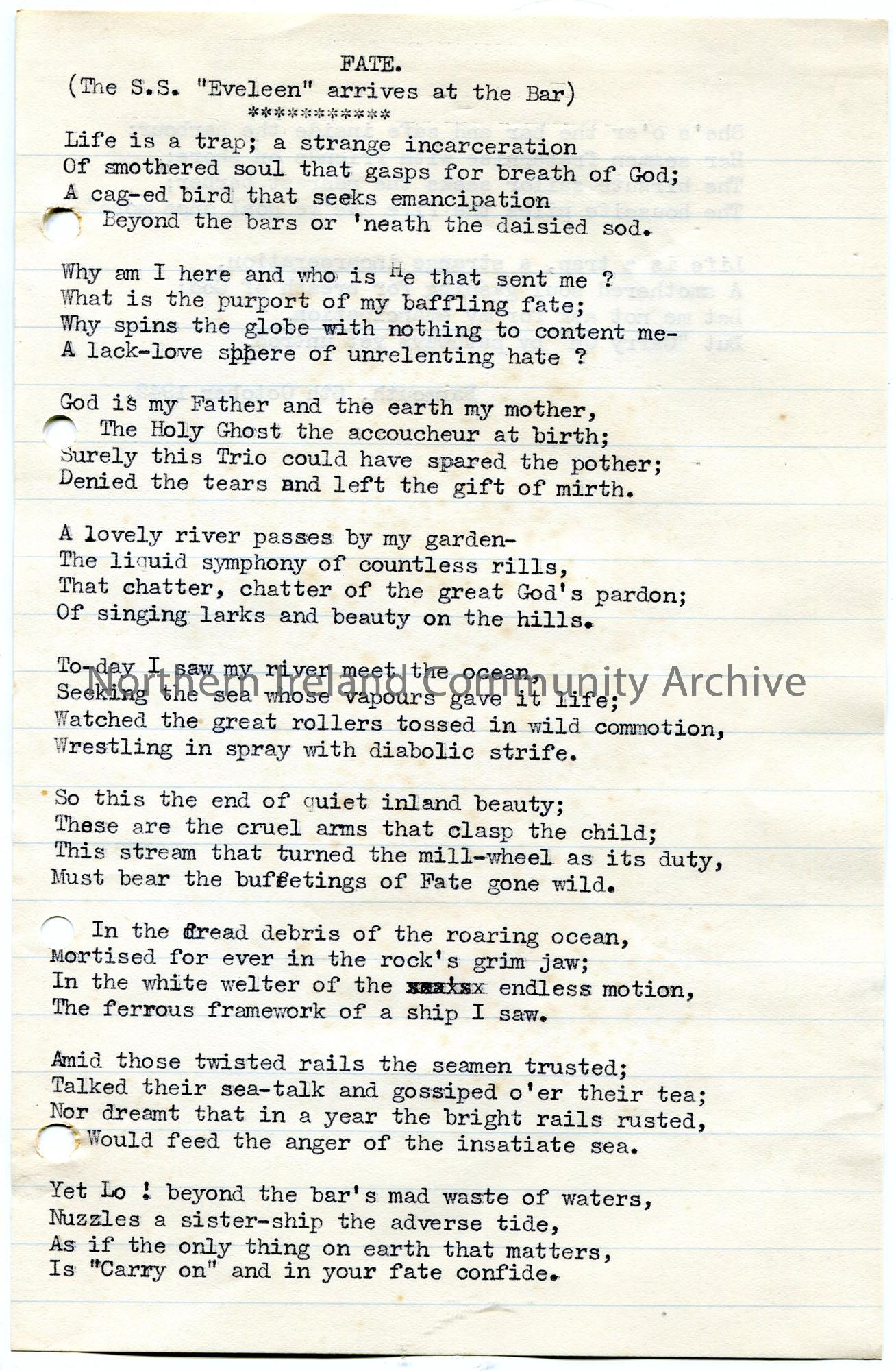 Typed poem on lined paper (double sided) titled, 'Fate (The S.S. "Eveleen" arrives at the Bar)'. Dated Barmouth, 6th October, 1942.