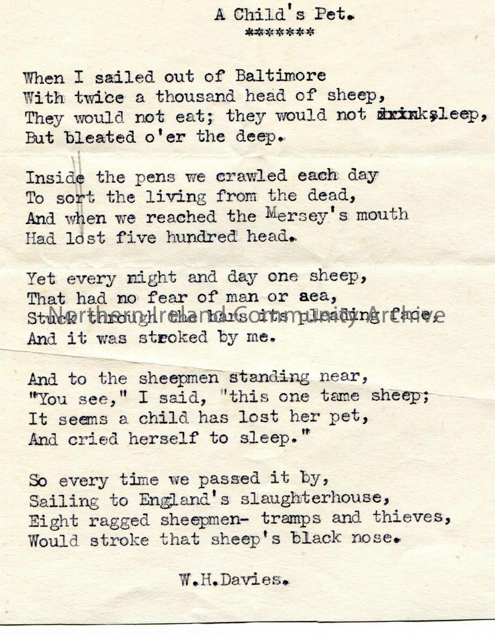 Typed poem or words to a song titled, ‘A Child’s Pet’. 5 verses. W.H.Davies.