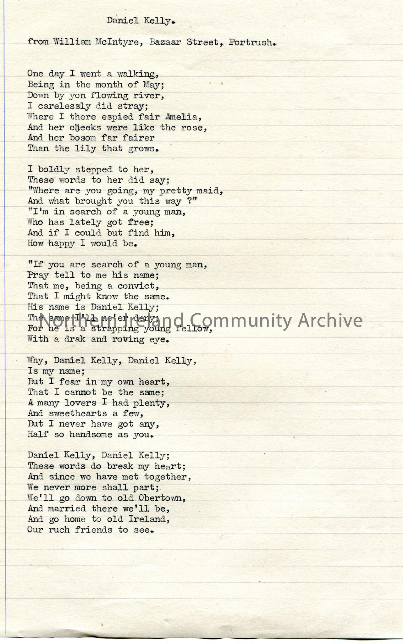 Typed poem or words to a song titled, ‘Daniel Kelly’. From William McIntyre, Bazaar Street, Portrush.