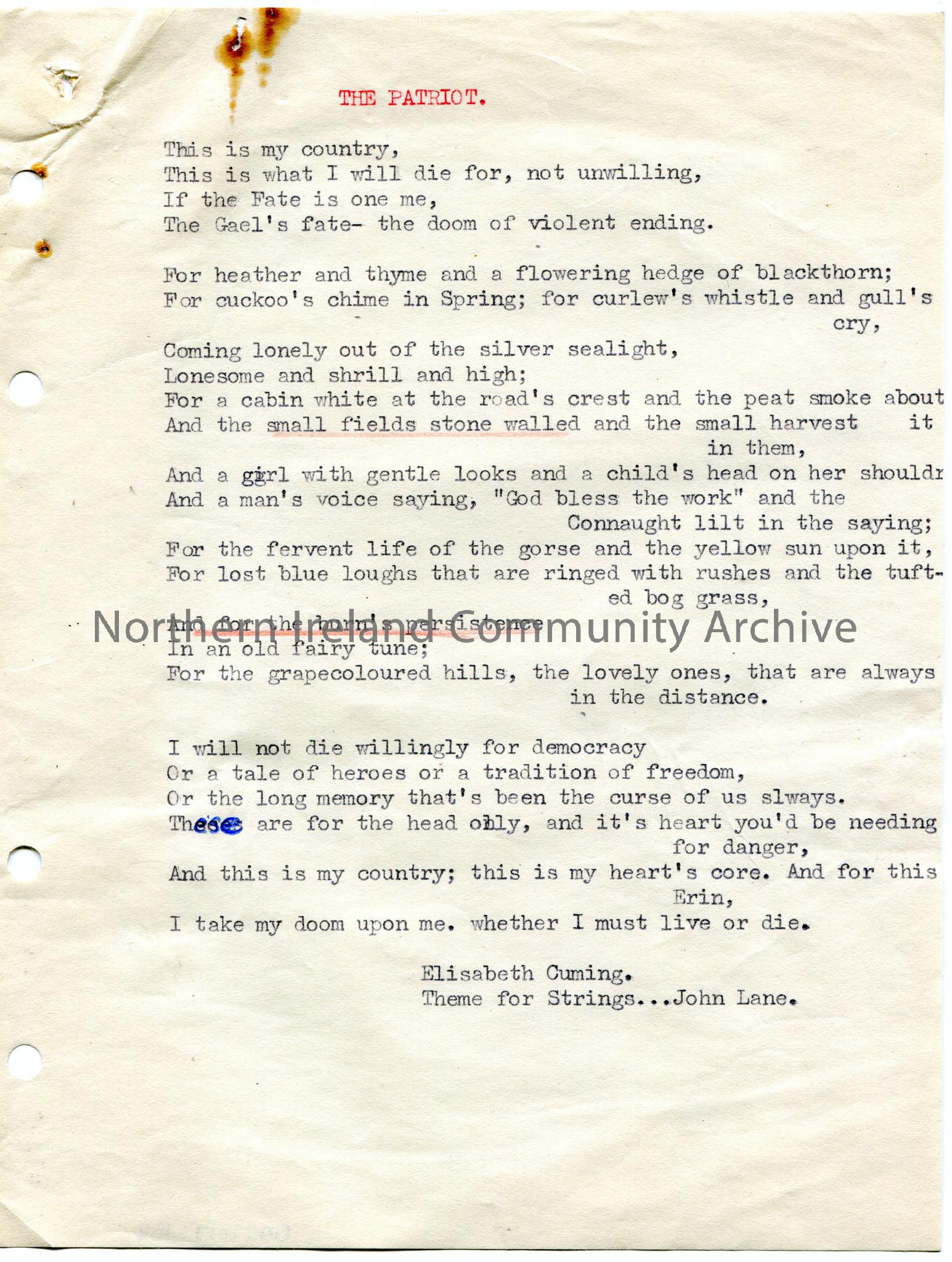 Typed poem or words to a song titled, ‘The Patriot’, by Elisabeth Cuming, Theme for Strings, John Lane. Re dying for one’s country. Mentions Connaught…