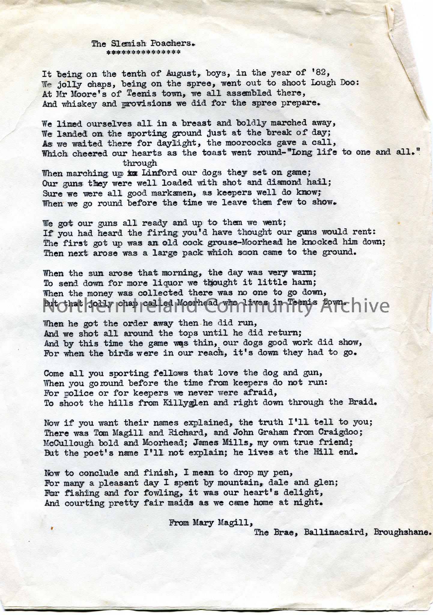 Typed poem or words to a song titled, ‘The Slemish Poachers’. From May Magill, The Brae, Ballinacaird, Broughshane. Nine verses.
