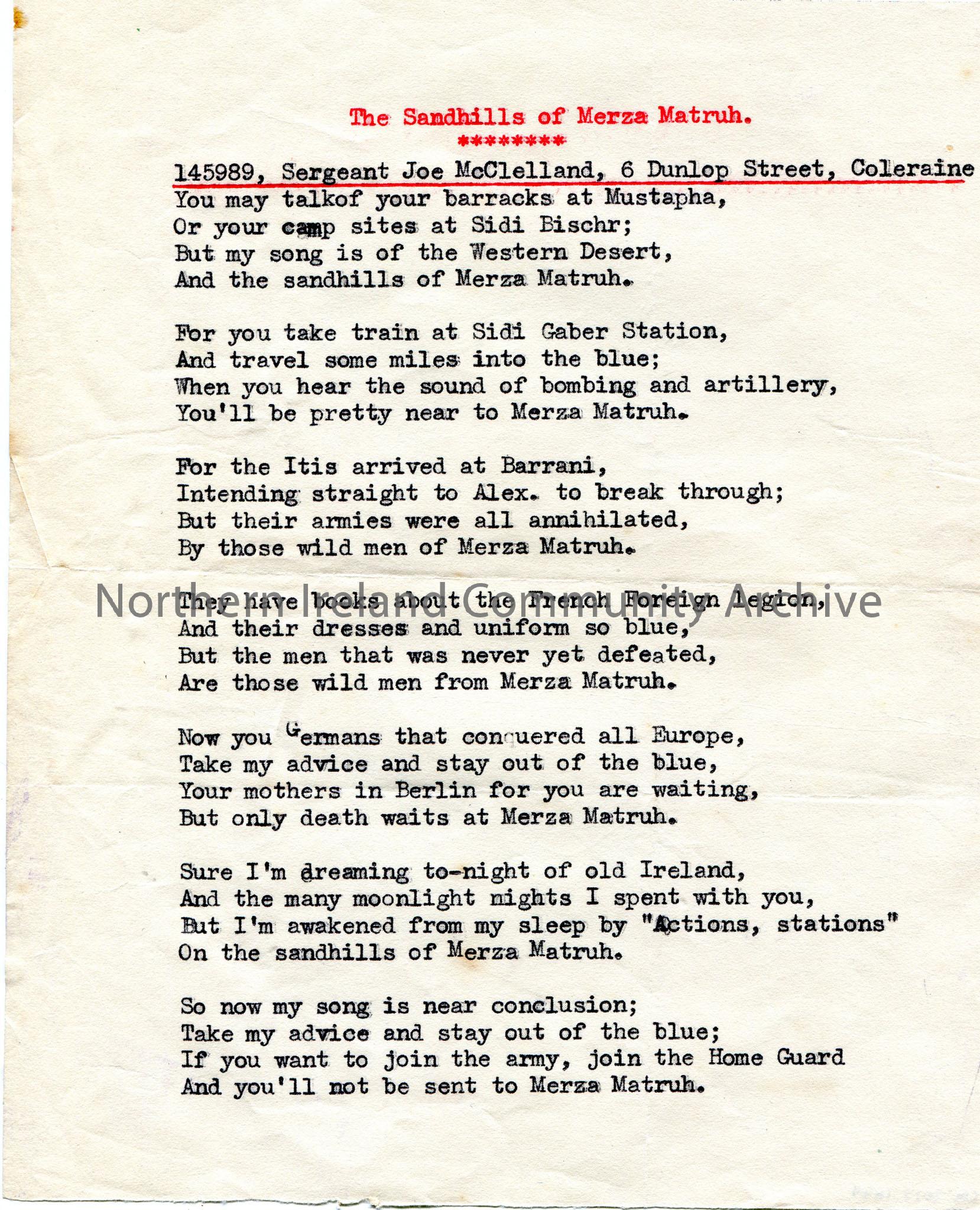 Typed poem or words to song, 7 verses, from 145989, Sergeant Joe McClelland of 6 Dunlop Street, Coleraine. Titled, ‘The Sandhills of Merza Matruh’.
