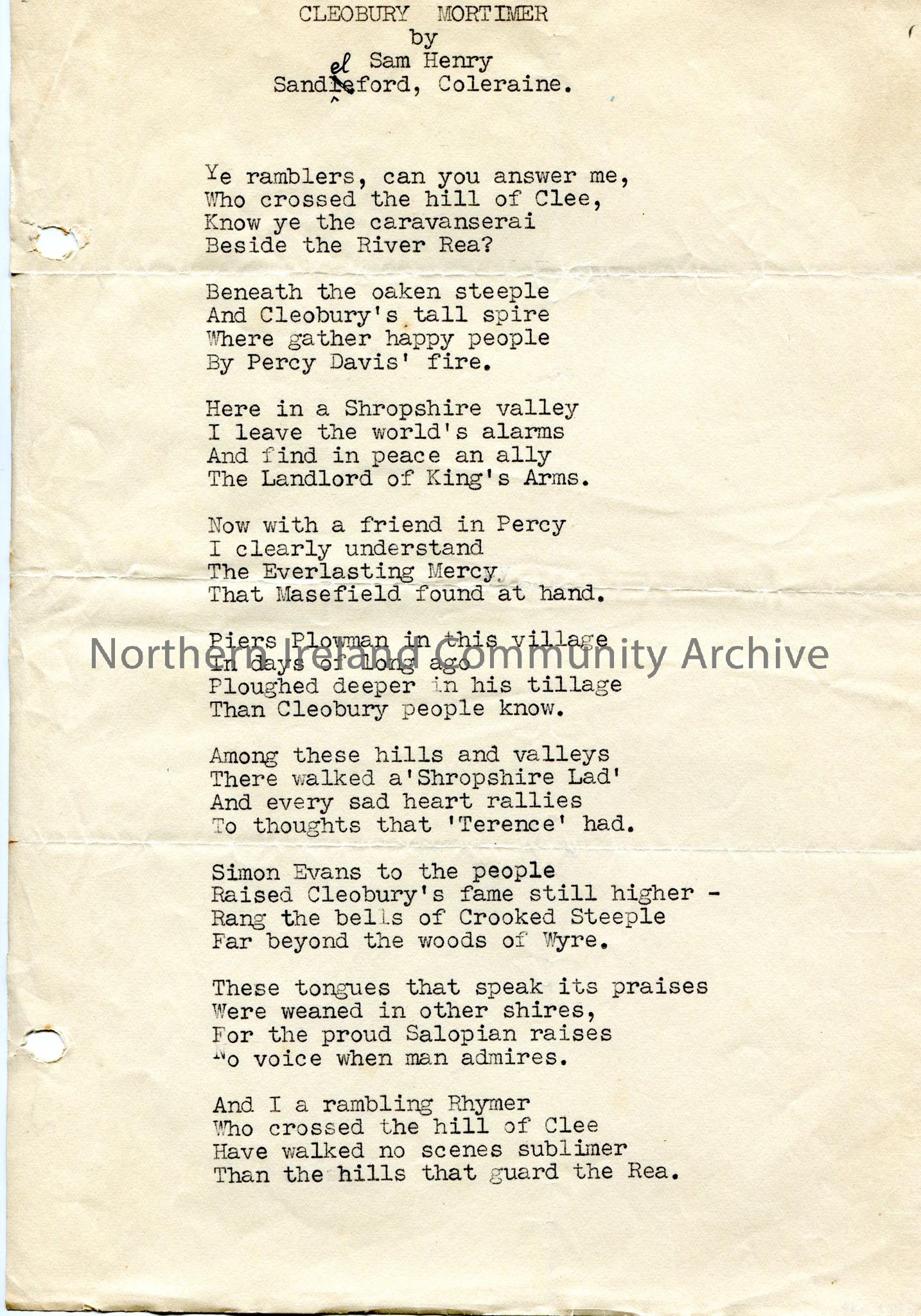 Typed poem or words to song by Sam Henry, Sandelford, Coleraine. Titled Cleobury Mortimer’. Mentions Shropshire, Percy Davis, Piers Plowman and Simon …