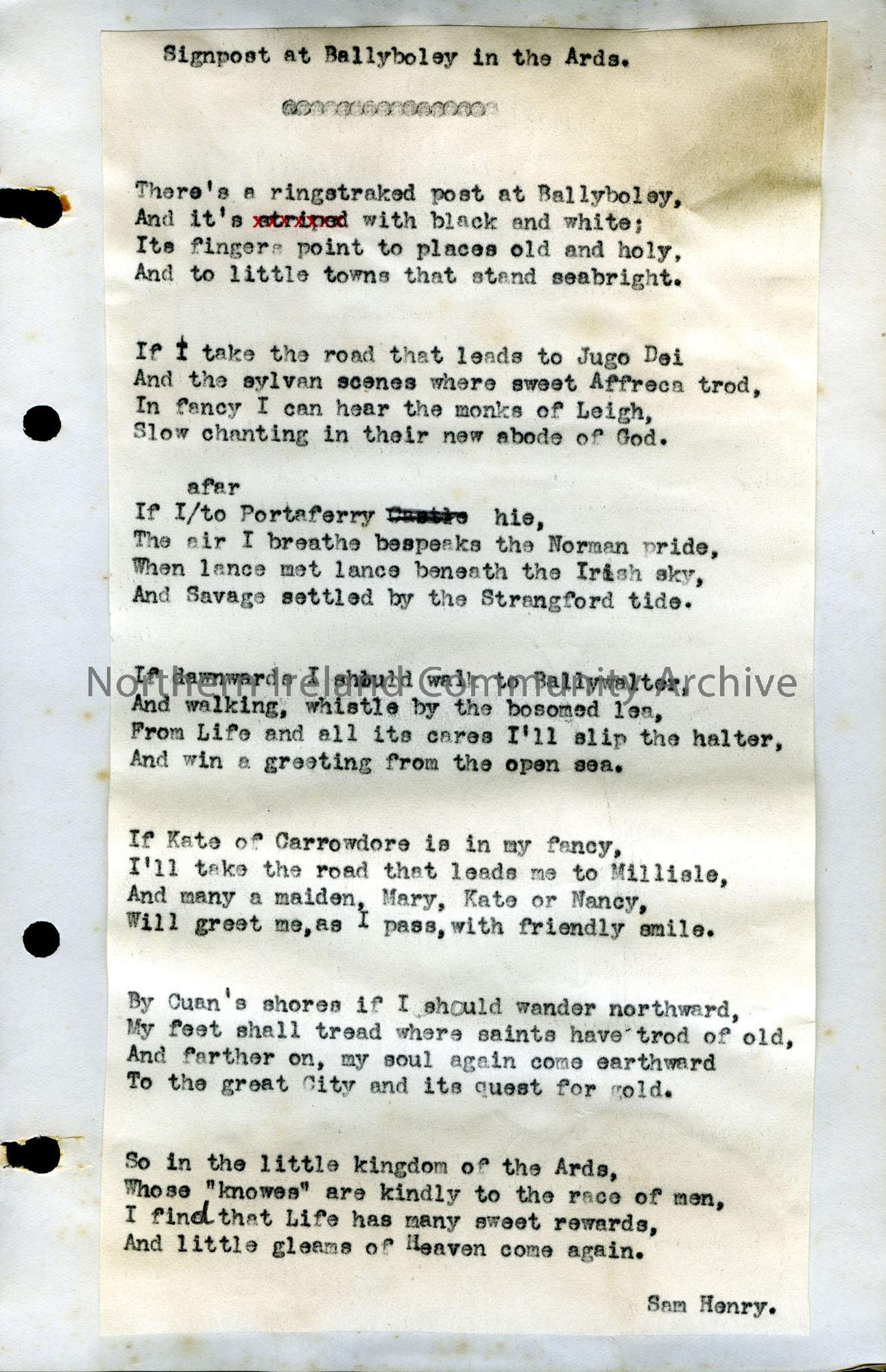 Typed poem or words to song by Sam Henry, titled ‘Signpost at Ballyboley in the Ards’.