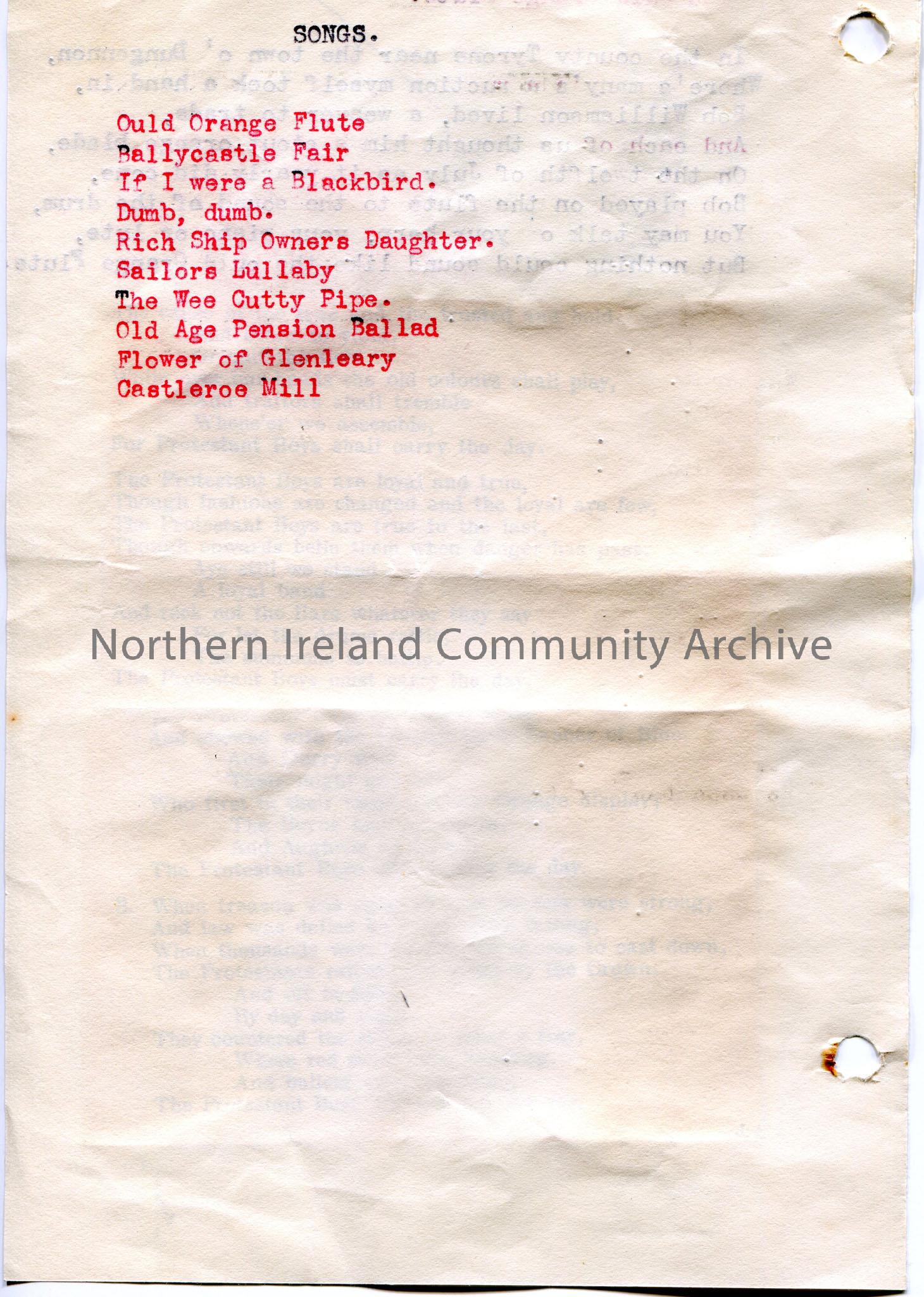 Typed poem or words to song (first verse). Rest of the song has been typed or printed on different and cut and stuck to the same page. Titled, 'The Ould Orange Flute'. Refers to County Tyrone. List of ten songs typed on reverse of page. Begins with 'Ould Orange Flute' and ends with 'Castleroe Mill'.