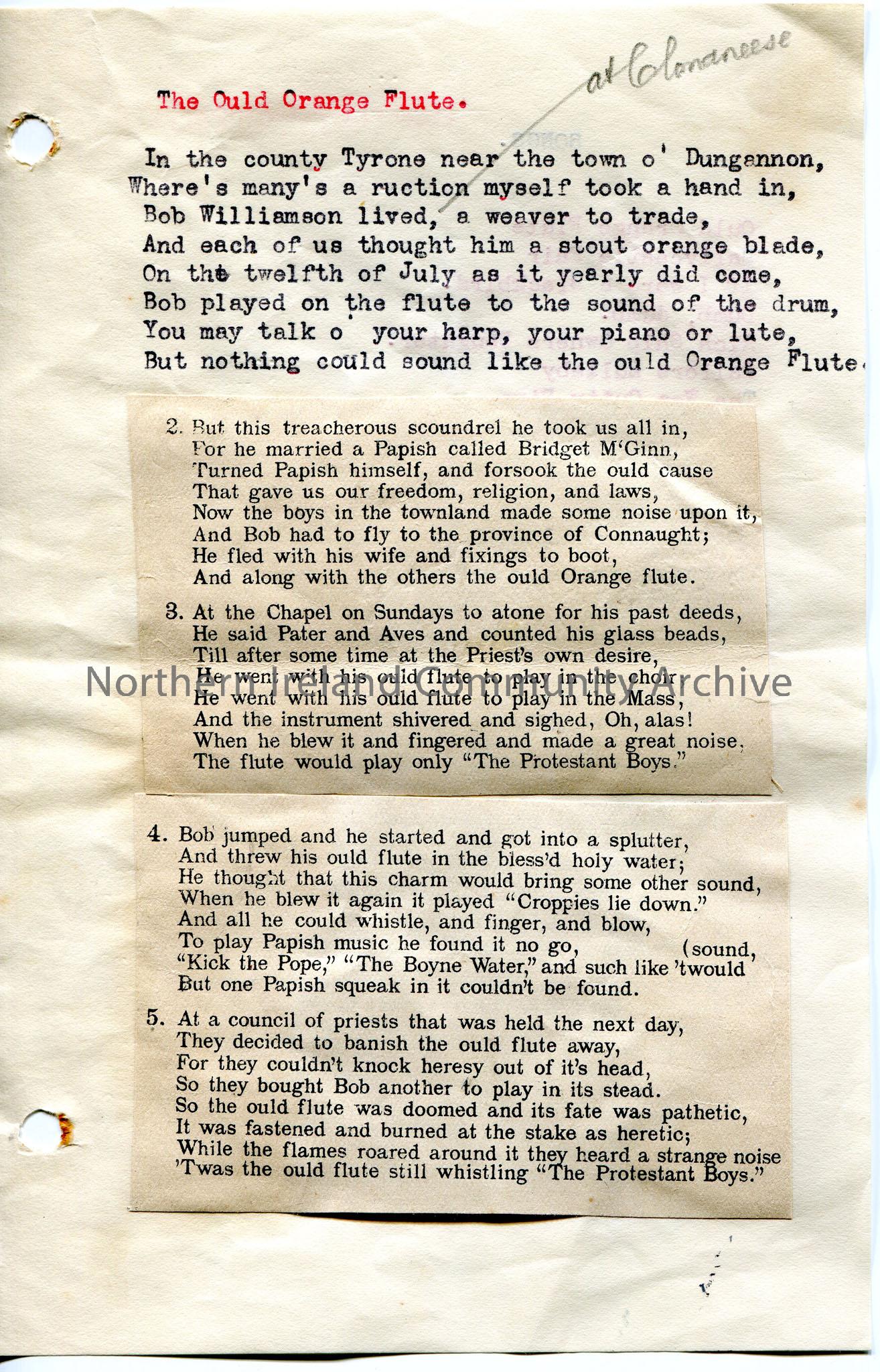 Typed poem or words to song (first verse). Rest of the song has been typed or printed on different and cut and stuck to the same page. Titled, 'The Ould Orange Flute'. Refers to County Tyrone. List of ten songs typed on reverse of page. Begins with 'Ould Orange Flute' and ends with 'Castleroe Mill'.