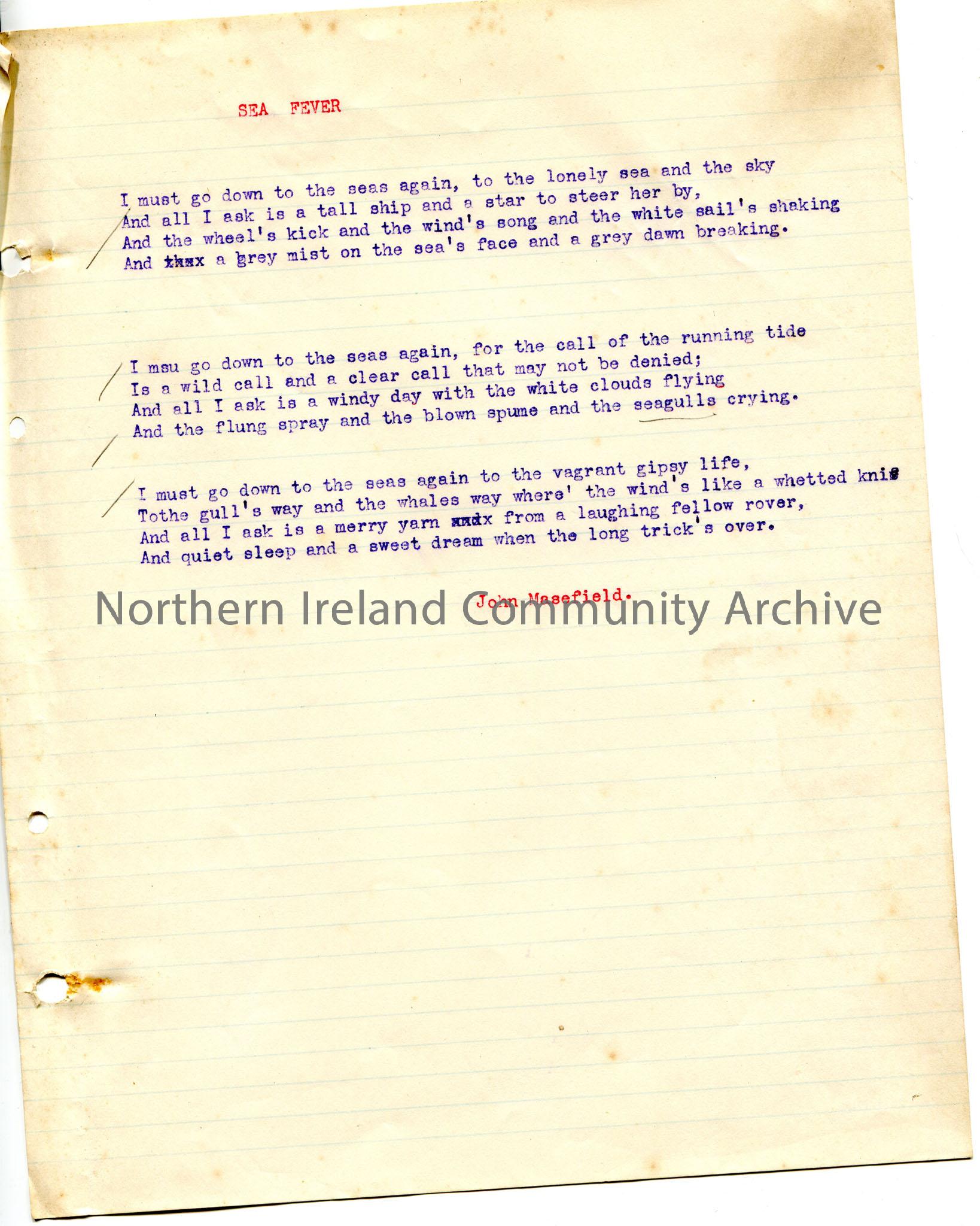 Typed poem or words to song on lined paper titled, ‘Sea Fever’ by John Masefield.