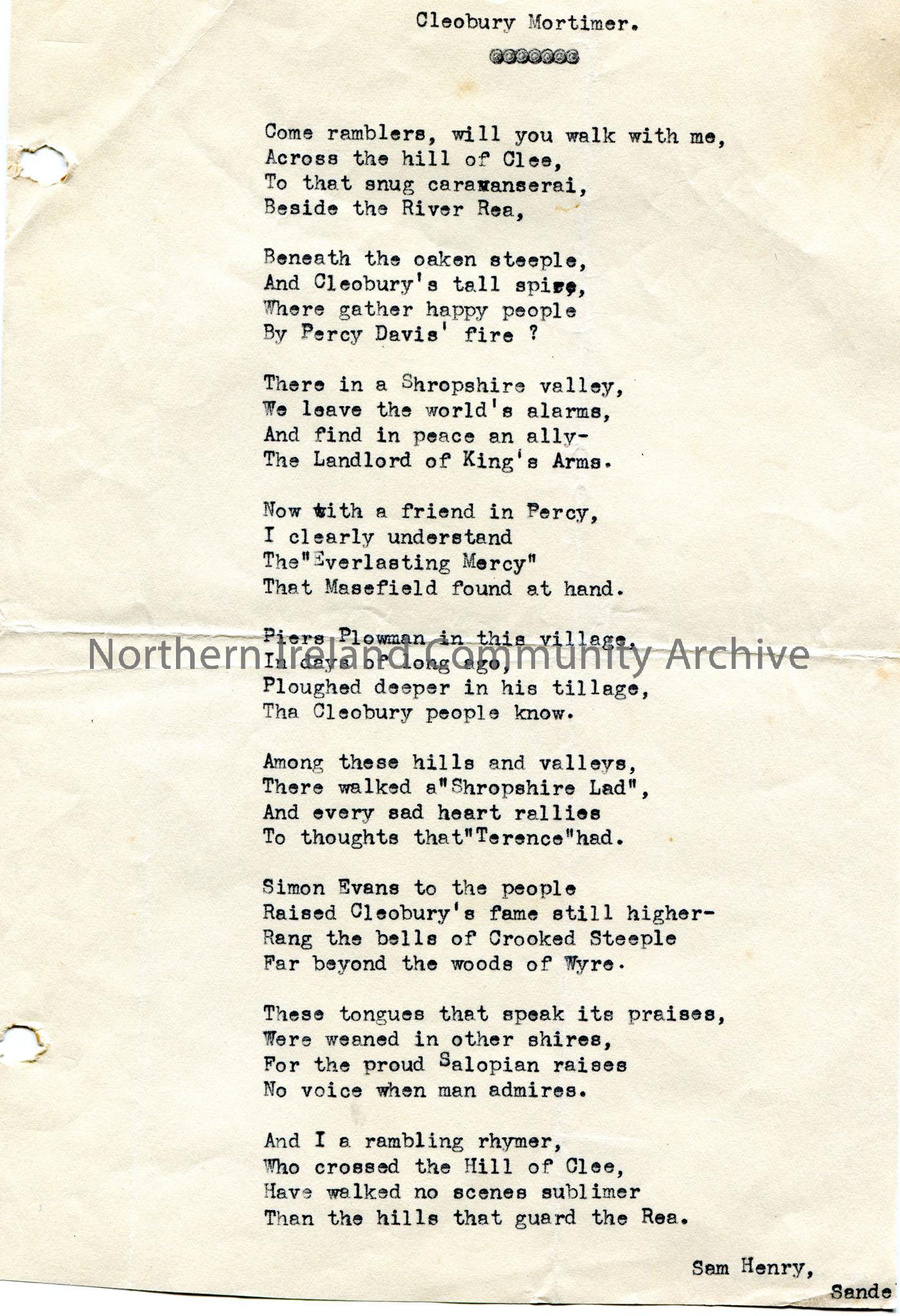 Typed poem or words to song titled, 'Cleobury Mortimer' by Sam Henry. Mentions Shropshire, Percy Davis and Simon Evans.