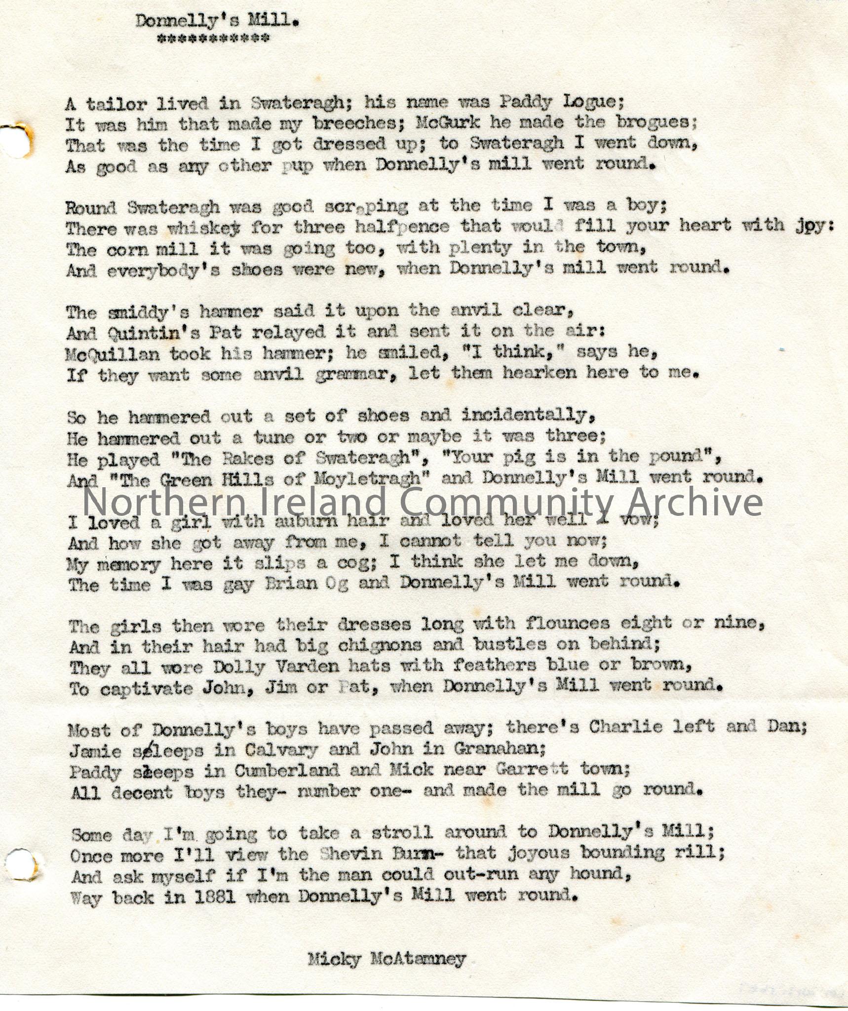 Typed poem or words to song titled, ‘Donnelly’s Mill’, 8 verses. By Micky McAtamney.