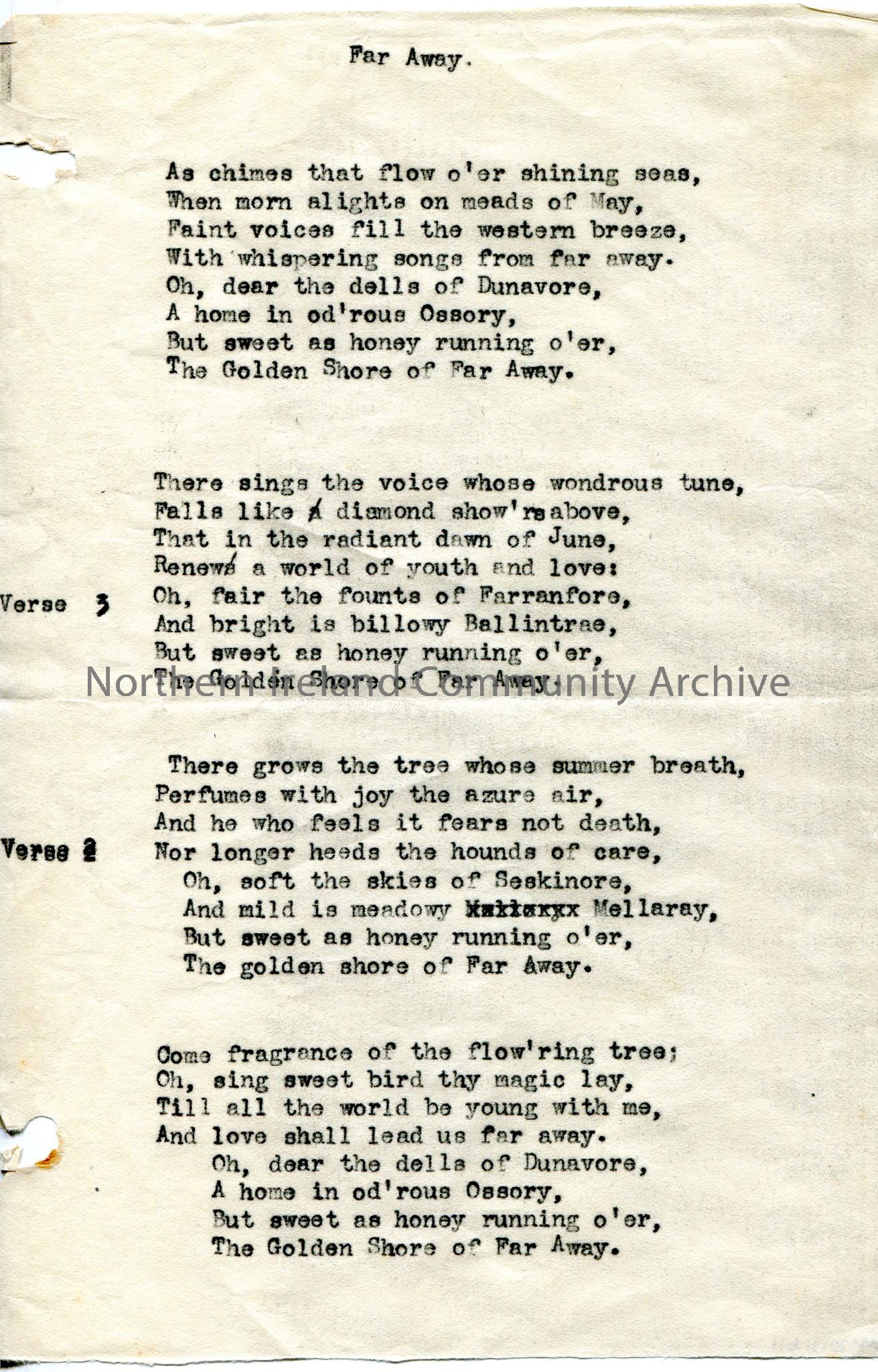 Typed poem or words to song titled, ‘Far Away’. Mentions Farranfore, Seskinore and Mellaray.