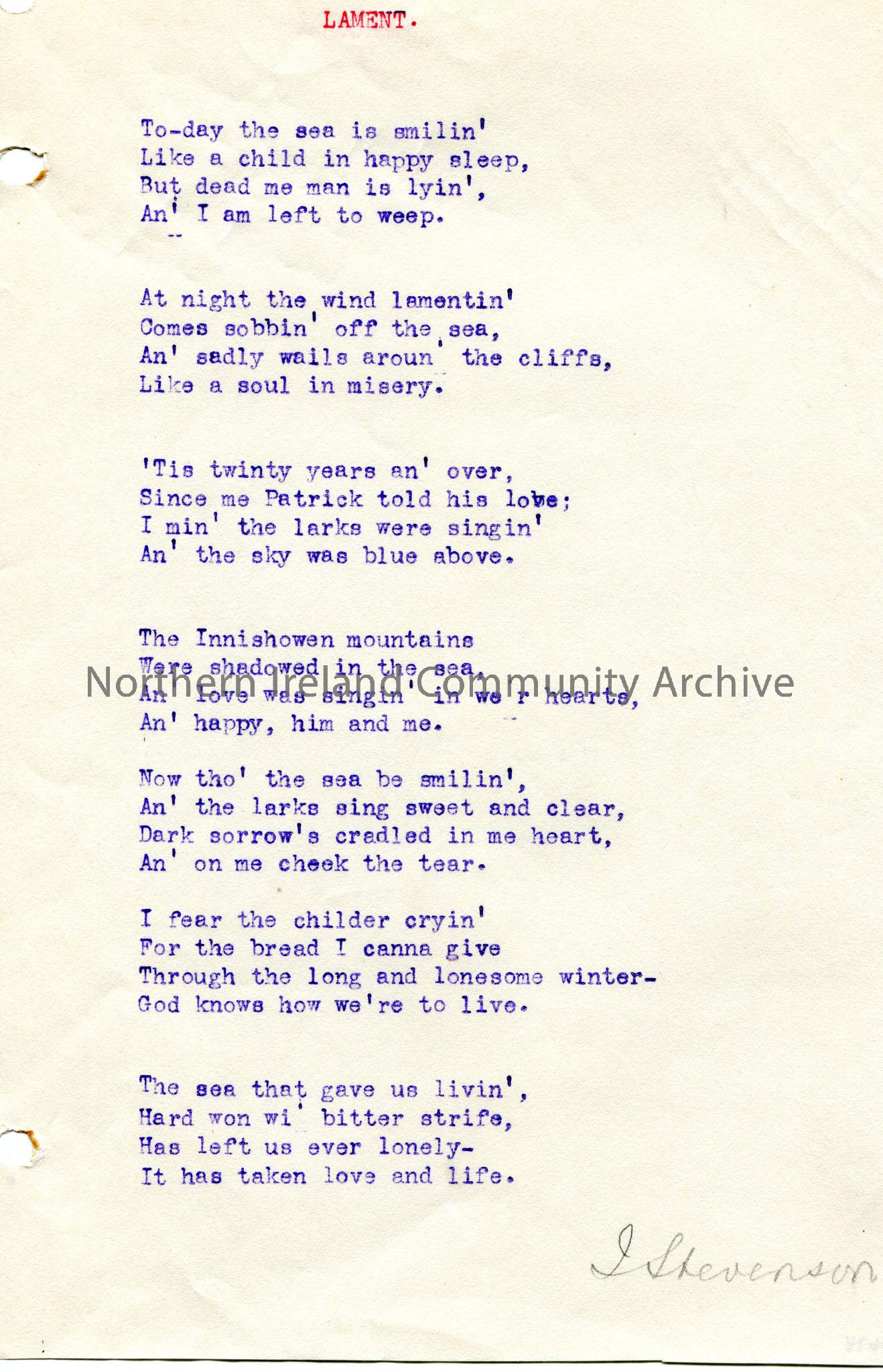 Typed poem or words to song titled, ‘Lament’. ‘I Stevenson’ handwritten in pencil bottom of page. Mentions Innishowen.