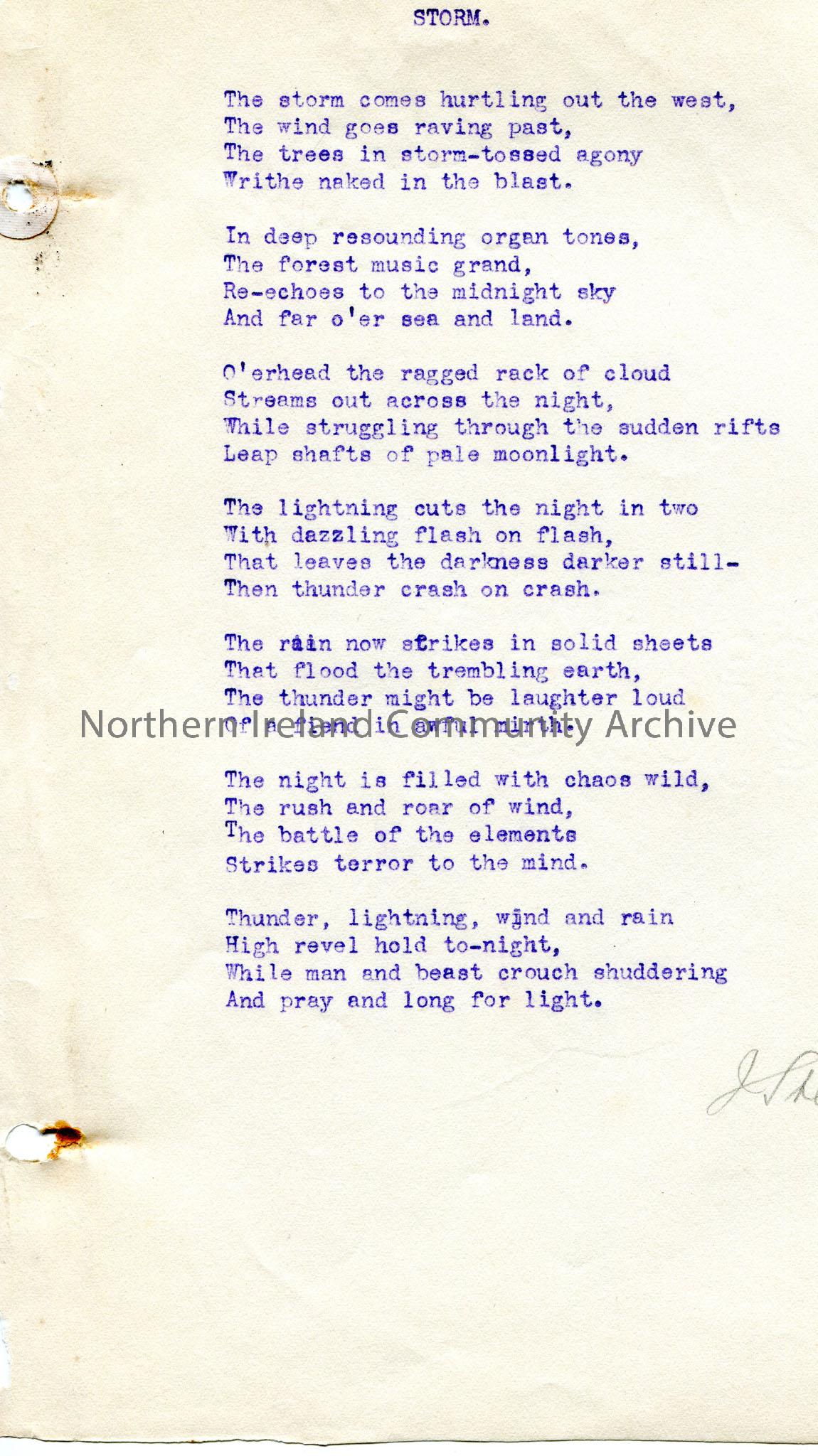 Typed poem or words to song titled, ‘Storm’ by J. Stevenson.
