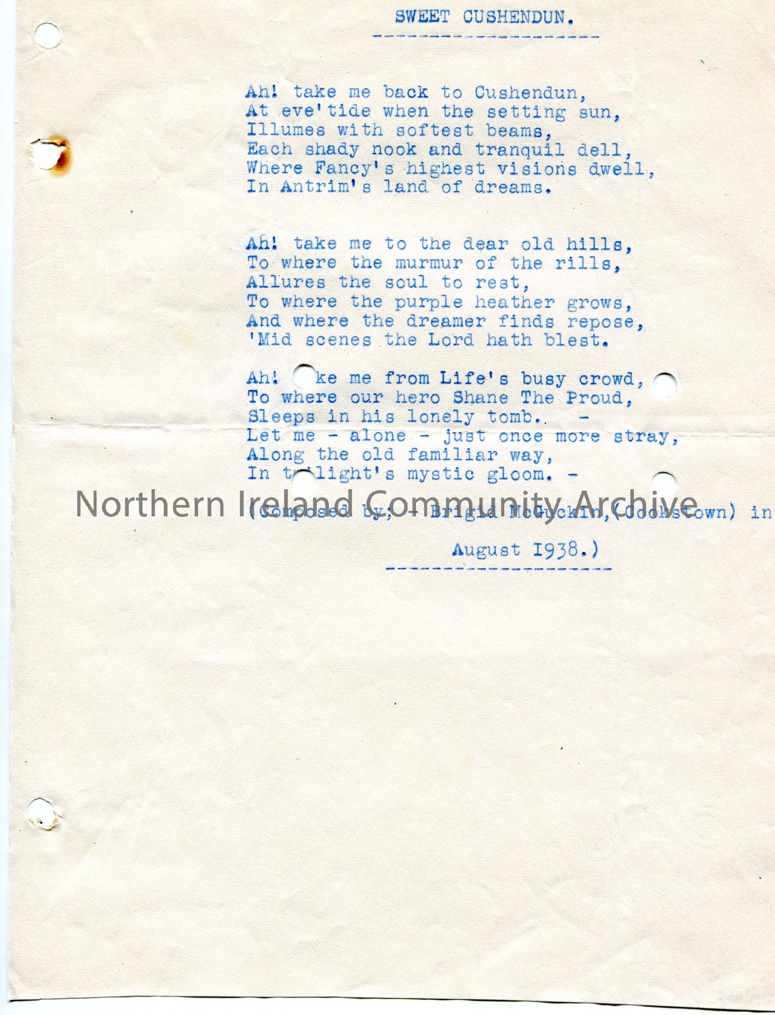Typed poem or words to song titled, ‘Sweet Cushendun’. Composed by Brigid McGuckin of Cookstown in August 1938.