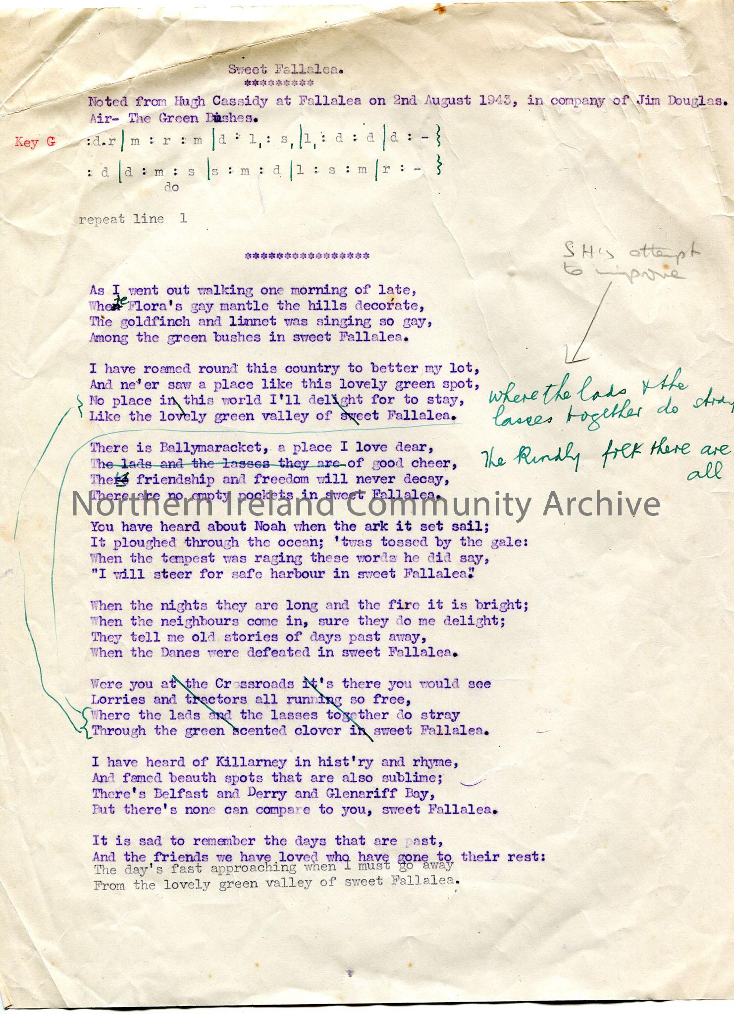 Typed poem or words to song titled, 'Sweet Fallalea'. Tonic sol-fa notation 'The Green Bushes'. Noted from Hugh Cassidy at Fallalea on 2nd August, 1943, in company of Jim Douglas. Verse and lines of poem scored out replaced. Mentions Ballymaracket, Killarney, Belfast, Derry and Glenariff Bay. 'Capt. R. M MacLeod VIII AFCC APO 639' handwritten on back of page.