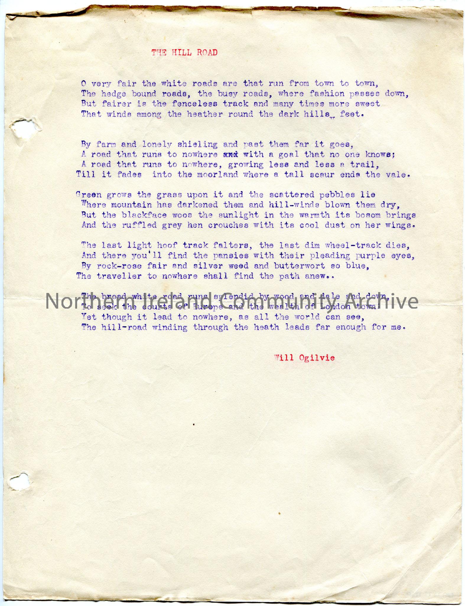 Typed poem or words to song titled, ‘The Hill Road’ from Will Ogilvie.