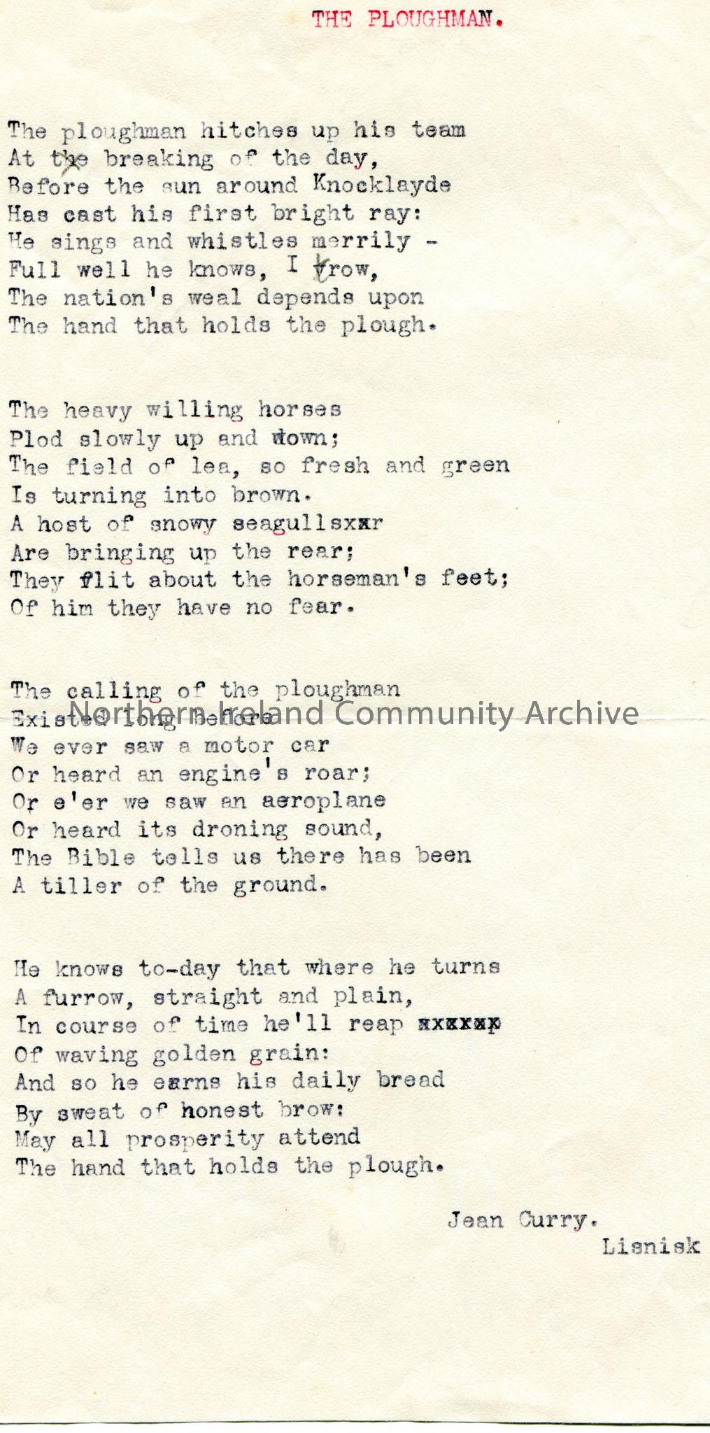 Typed poem or words to song titled, ‘The Ploughman’. From Jean Curry, Lisnisk. 4 verses. Mentions Knocklayde.