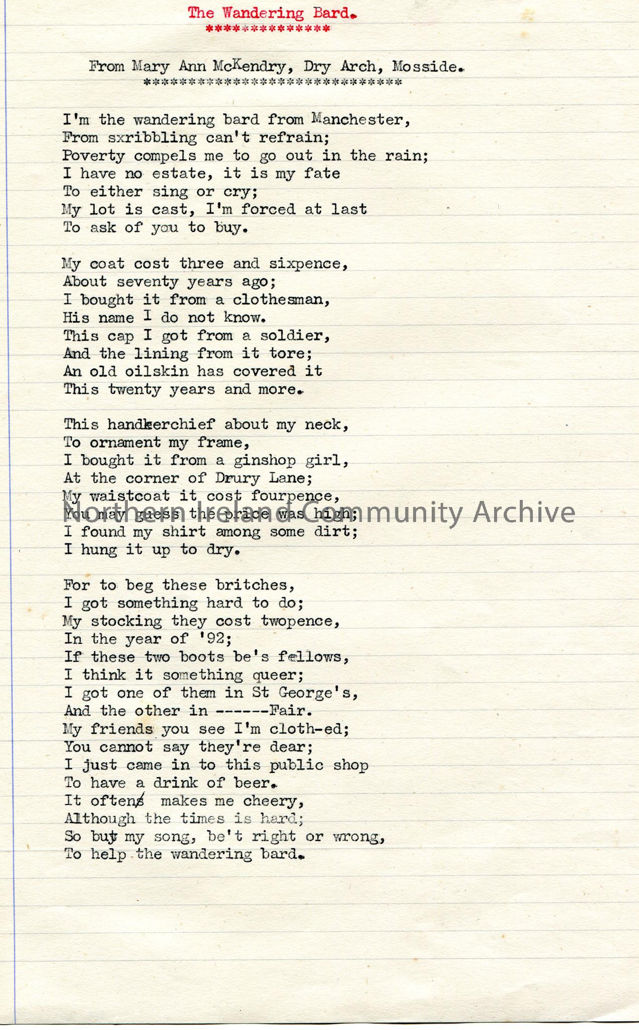 Typed poem or words to song titled, ‘The Wandering Bard’. From Mary Ann McKendry, Dry Arch, Mosside. Re the wandering bard from Manchester.
