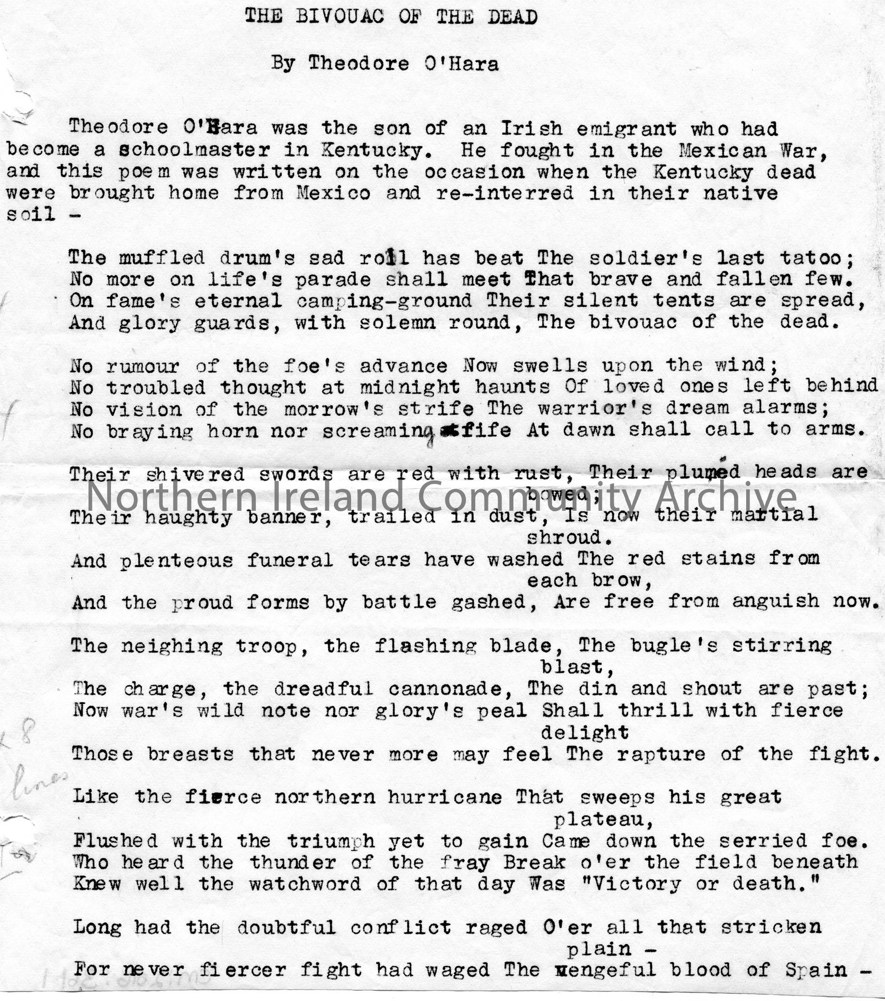 Typed poem, "The Bivouac of the Dead", by Theodore O'Hara. 2 pages.