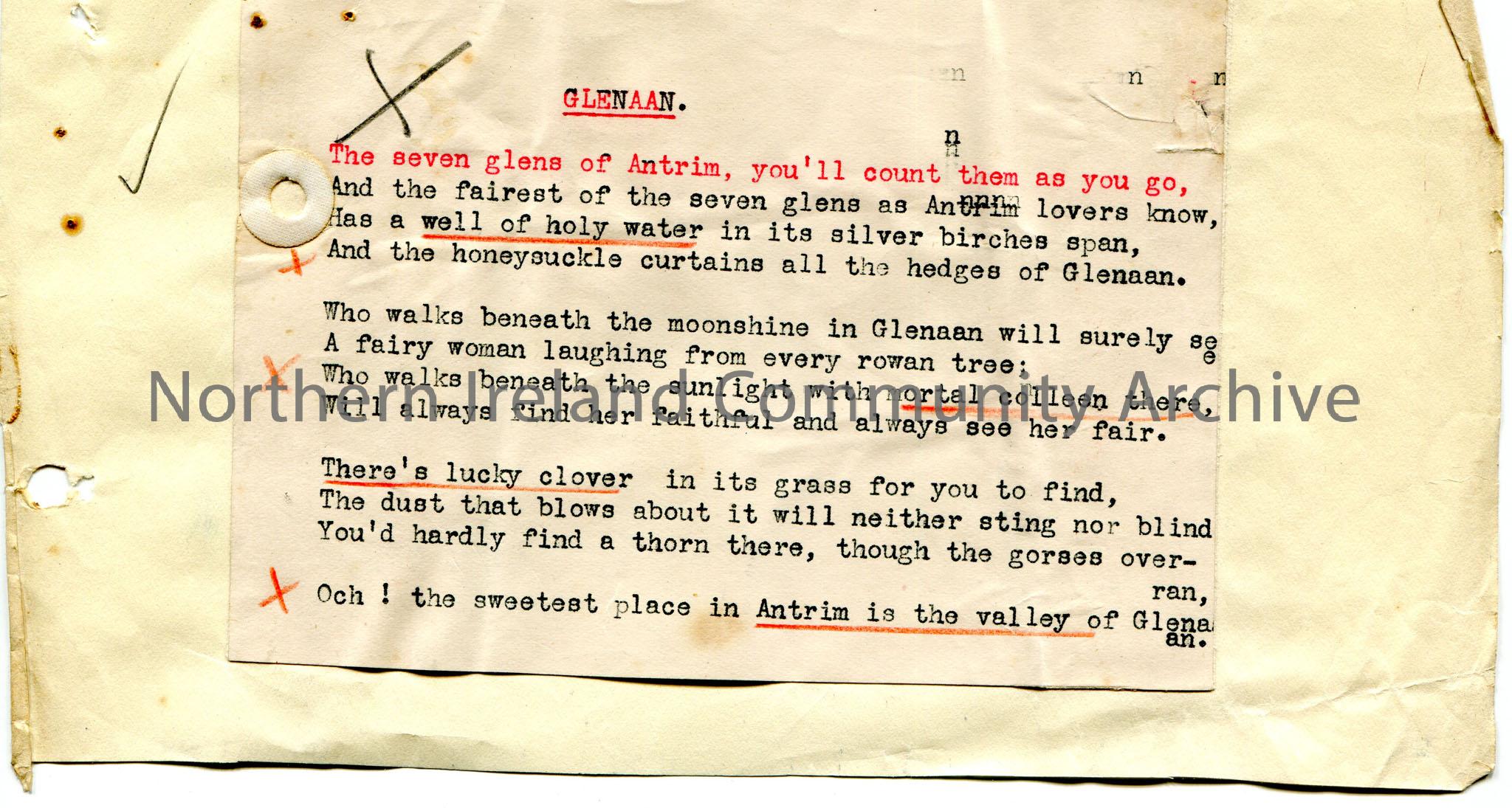 Typed poem titled, ‘Glenaan’. Re the valley of Glenaan in the glens of Antrim.