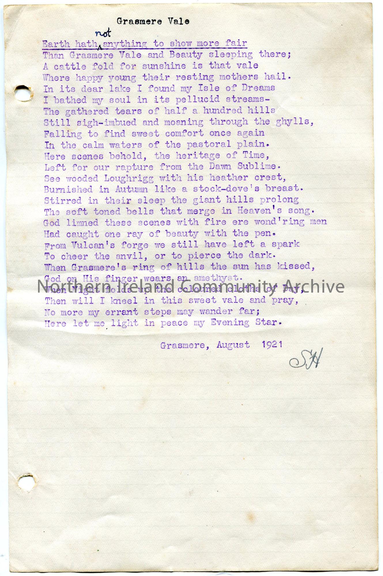 Typed poem titled, 'Grasmere Vale'. By Sam Henry. Dated August, 1921.