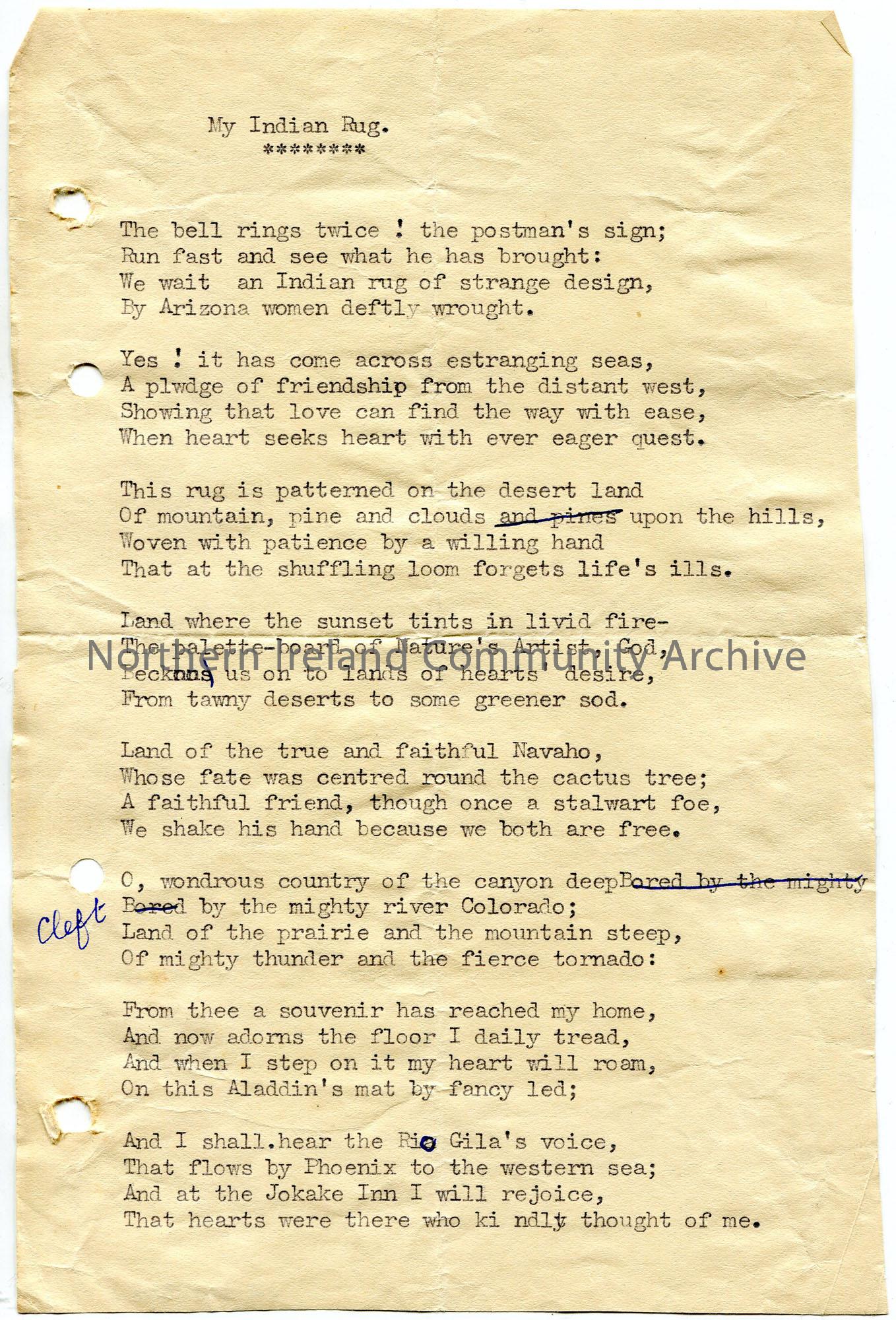 Typed poem titled, ‘My Indian Rug’. Annotated in blue ink. Re the delivery of a rug from America.