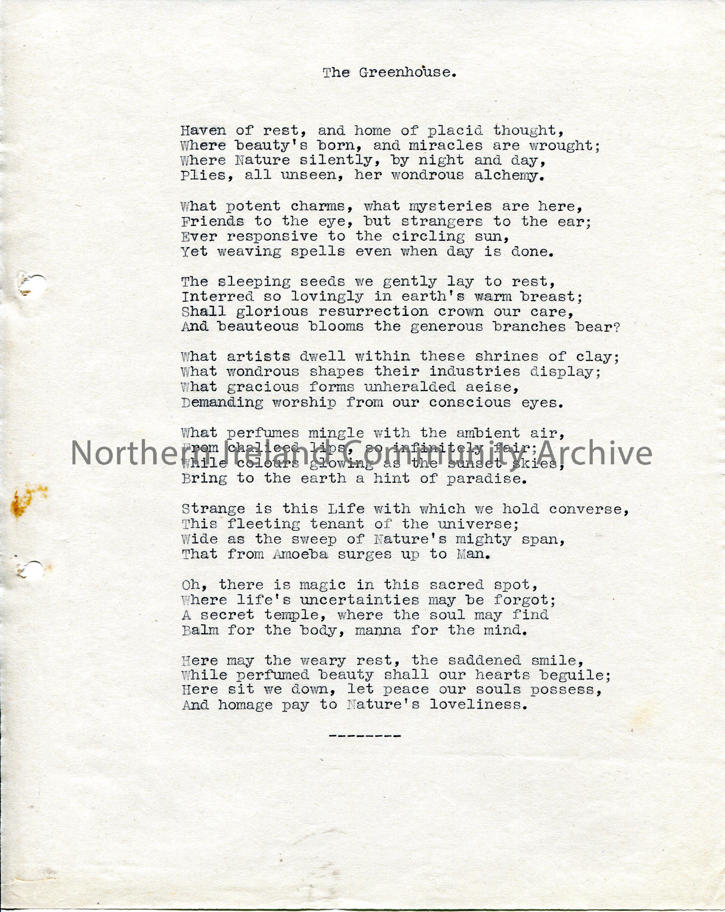 Typed poem titled, ‘The Greenhouse’.