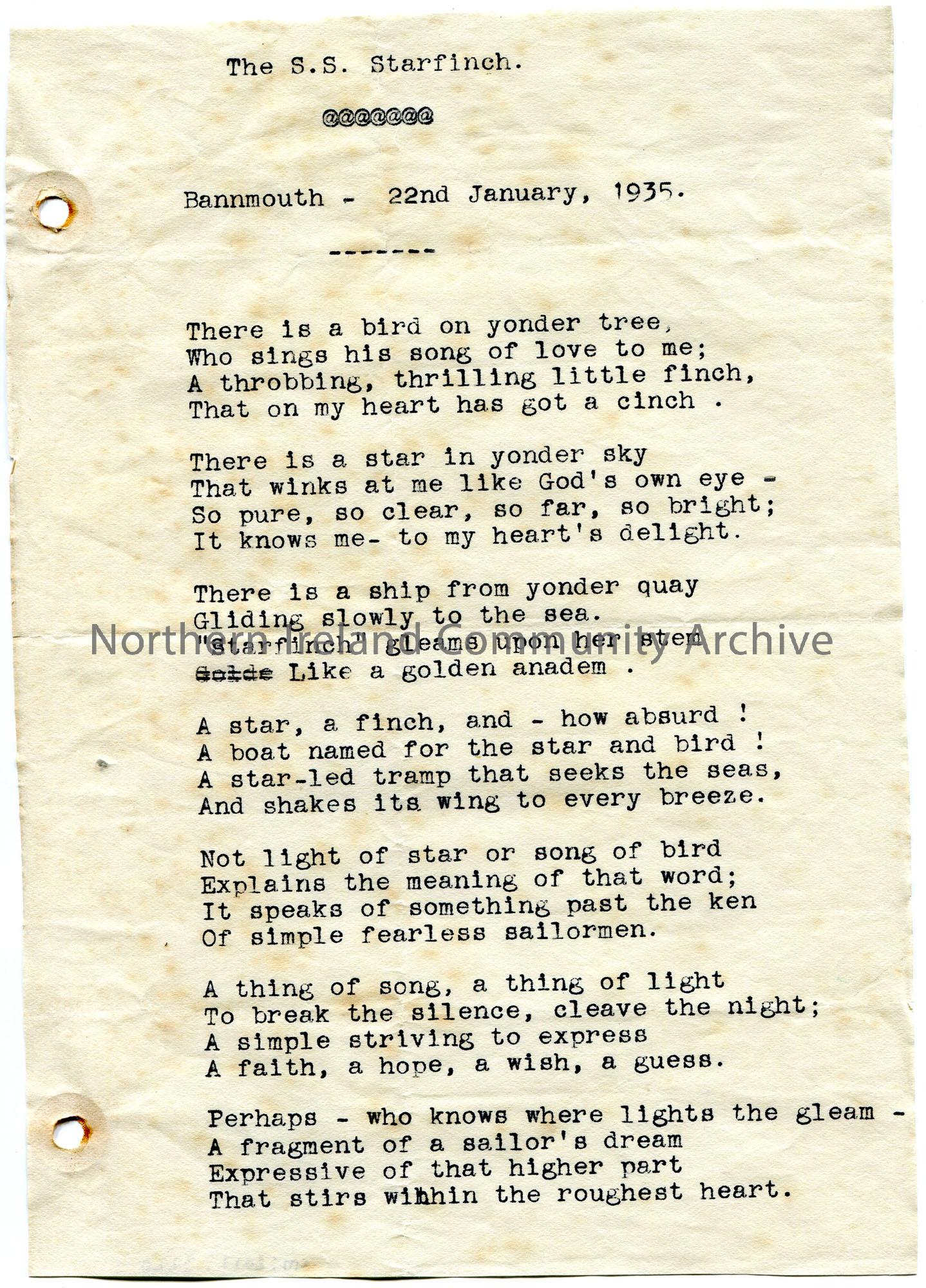 Typed poem titled, ‘The S.S. Starfinch. Bannmouth – 22nd January 1935’.