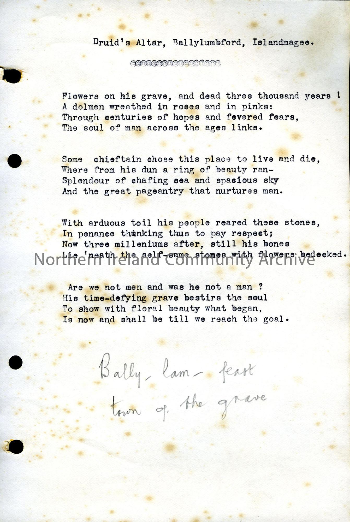 Typed poem with 4 verses titled ‘Druid’s Altar, Ballylumbford, Islandmagee’. Description of the grave ‘three milleniums after’ Druid was buried. ‘ball…