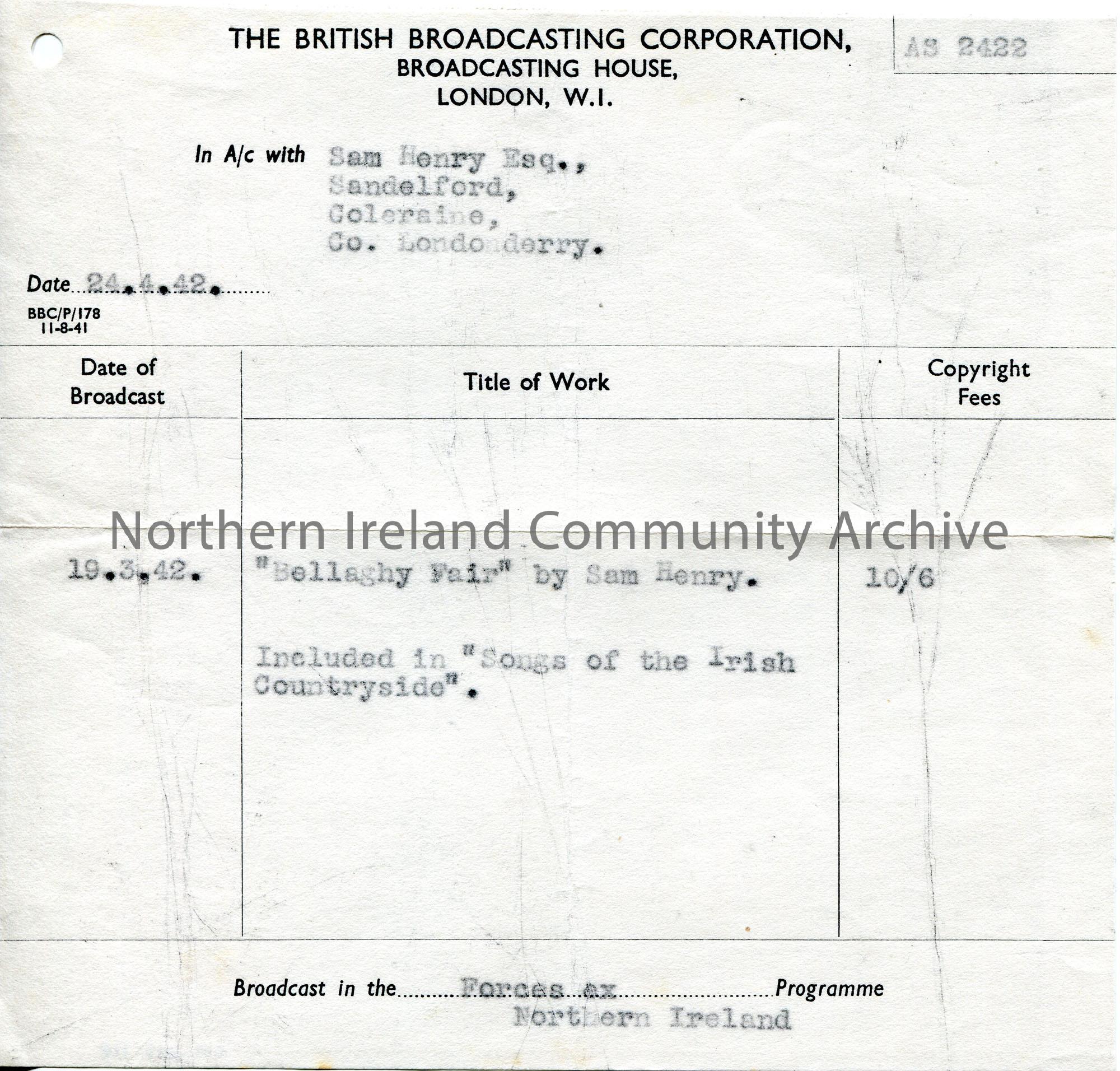 Typed receipt on headed paper to Sam Henry, Sandelford, Coleraine. Dated 24th April 1942. The sum of 10/6 for copyright fees for "Bellaghy Fair" by Sam Henry, 'Included in "Songs of the Irish Countryside"'. It was broadcast on 19th March 1942 in the 'Forces ex Northern Ireland' Programme.